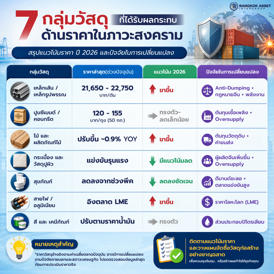 สินค้าที่มีโครงสร้างต้นทุนทางพลังงานสูง เช่น เหล็ก ปูนซีเมนต์ และกระเบื้อง มีสัดส่วนค่าพลังงานอยู่ที่ 35–50% ของต้นทุนรวม ดังนั้นเมื่อมีการปรับขึ้นราคาน้ำมัน ราคาปลายทางจึงขยับตามอย่างหลีกเลี่ยงไม่ได้ โดยข้อมูลจาก SCB EIC ระบุไว้ว่าราคา Billet (วัตถุดิบเหล็ก) ในจีนปรับตัวสูงขึ้น 6% ในช่วงเดือนกุมภาพันธ์ 2026