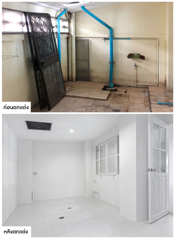 เชื่อมต่อห้องครัว และปูพื้นกระเบื้องกันลื่นเพื่อความปลอดภัย เปลี่ยนโทนสีห้องเป็นสีขาวสะอาดตา พร้อมทุกการใช้งาน