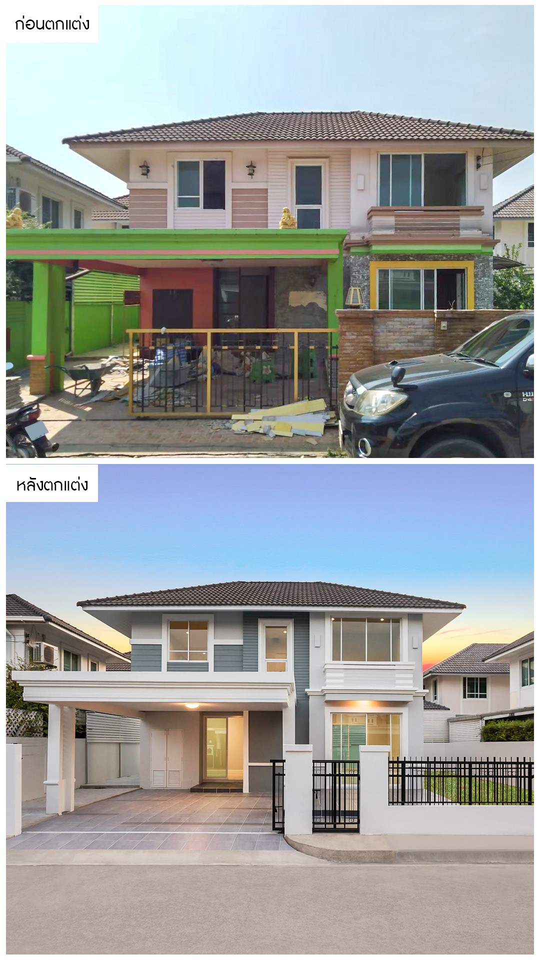 ส่วนของภายนอกตัวบ้าน เราได้ทาสีใหม่ทั้งหลัง เป็นสีเทาตัดขาว ให้ความรู้สึกที่ดูอบอุ่น เรียบหรู เหมาะกับสไตล์ของครอบครัวยุคใหม่ และเปลี่ยนรั้วเป็นสีดำ-ขาวแบบโมเดิร์นให้รับกับตัวบ้าน