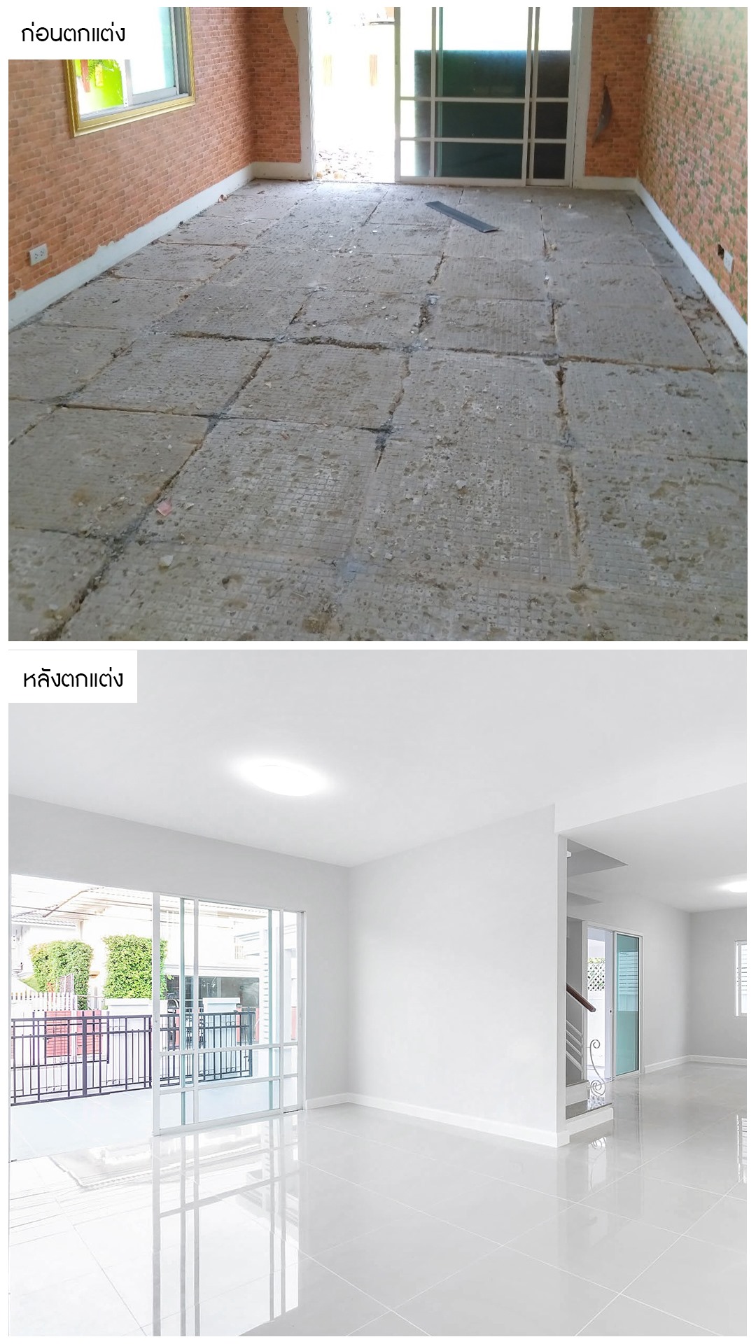 มาถึงภายในตัวบ้าน เราได้ปรับพื้นใหม่ทั้งหมดโดยการปูด้วยกระเบื้องแกรนิโต้แผ่นใหญ่ และทาสีภายในให้เป็นโทนสว่าง ทำให้บ้านดูโปร่งกว้างขึ้นมากเลยครับ