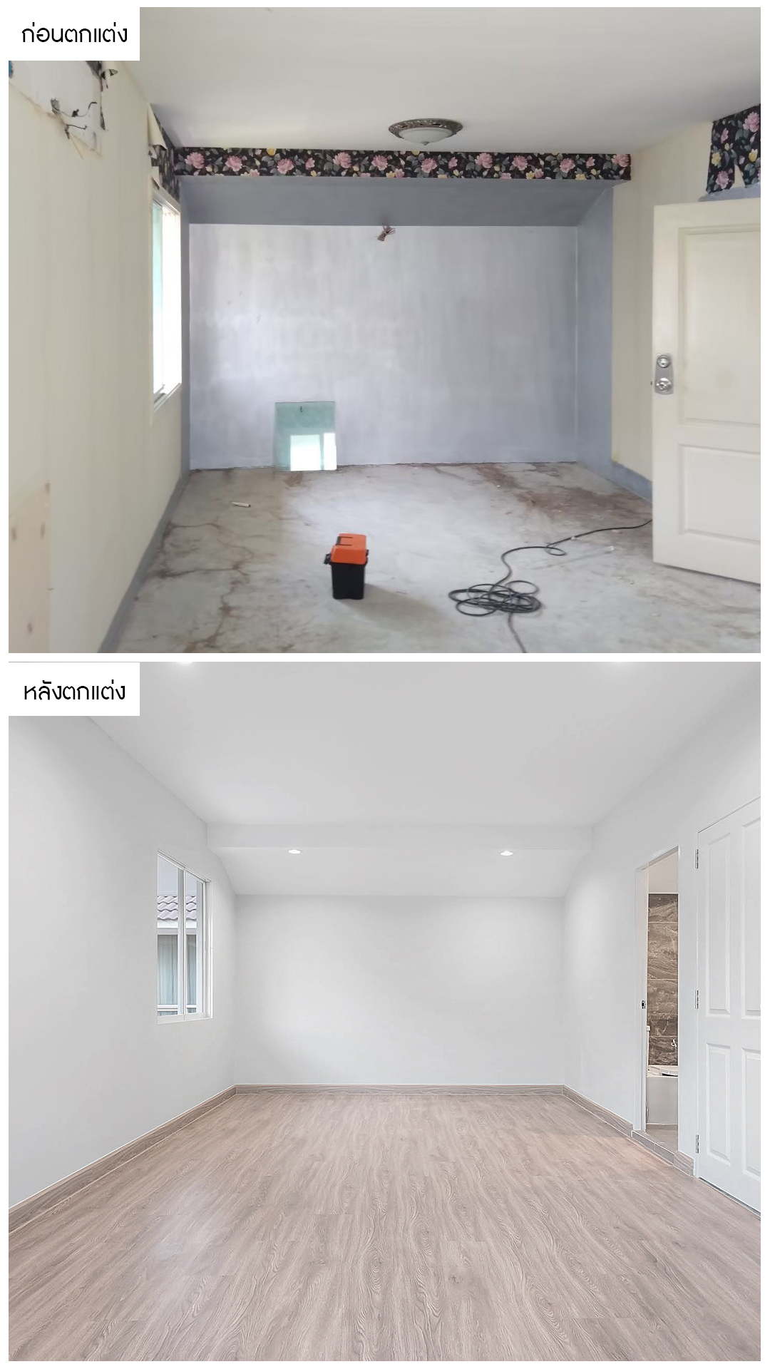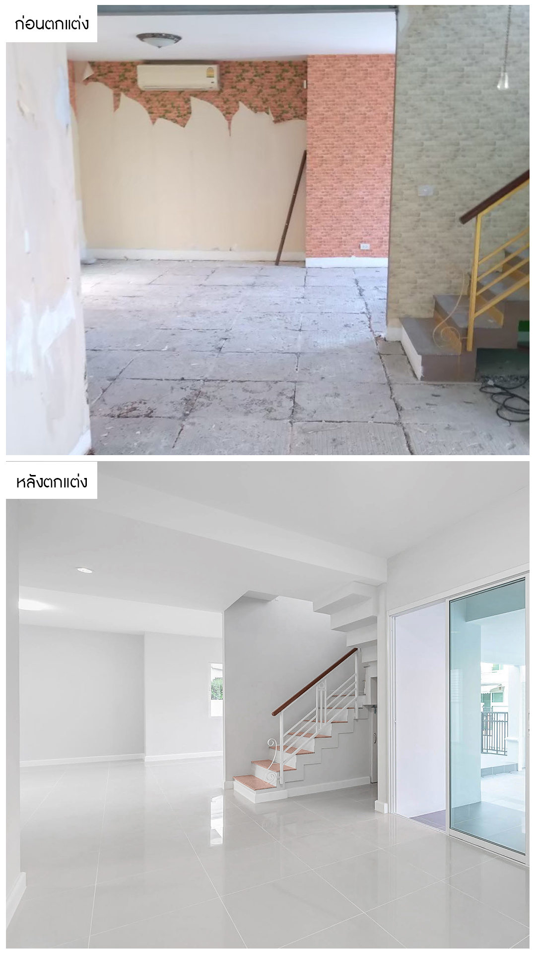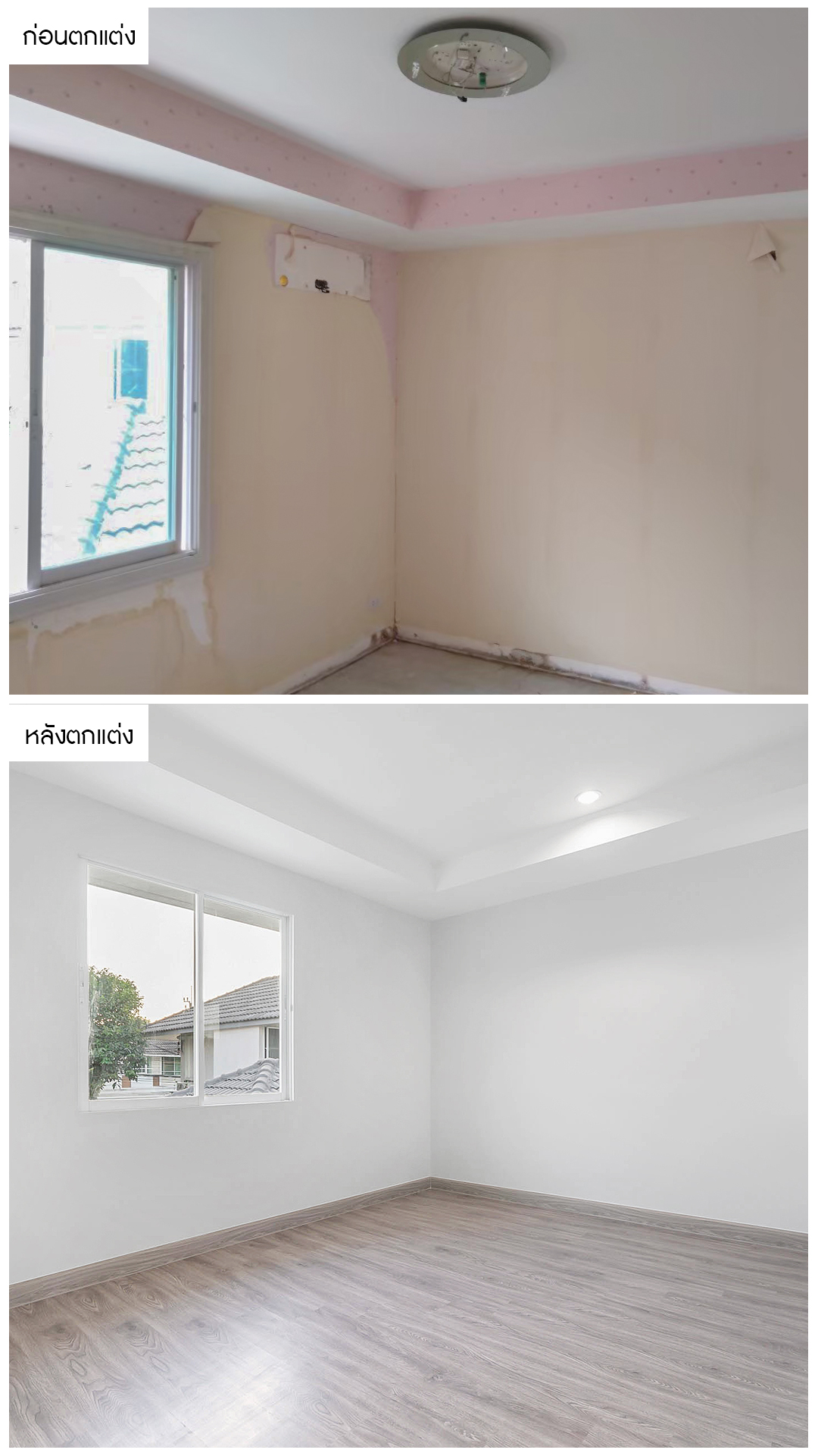 จากที่เจ้าของบ้านเดิมได้ติดวอลเปเปอร์เพื่อแบ่งโซนของแต่ละห้อง เราได้ทาสีใหม่ให้ดูเรียบง่าย สบายตา เพื่อให้เจ้าของบ้านคนใหม่ใช้ไอเดียตกแต่งได้อย่างเต็มที่