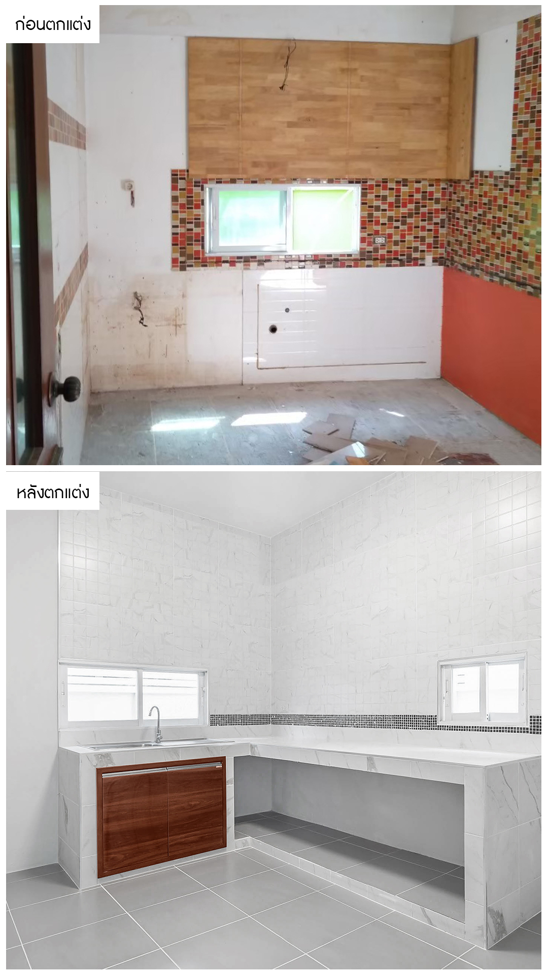 ในส่วนของห้องครัวได้ทำการปูกระเบื้องใหม่ทั้งหมด และติดตั้งเคาน์เตอร์ให้สวยงามพร้อมใช้งาน