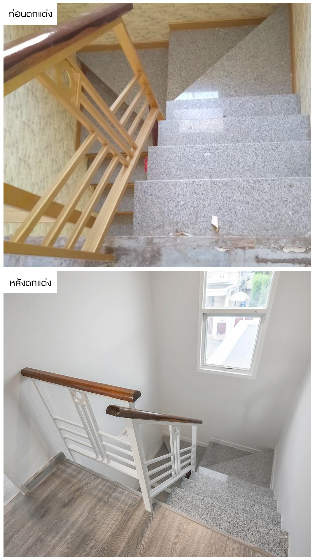 ส่วนของตัวบันไดยังใช้แบบเดิม และทาสีราวบันไดใหม่ ให้เป็นโทนเดียวกับตัวบ้าน
