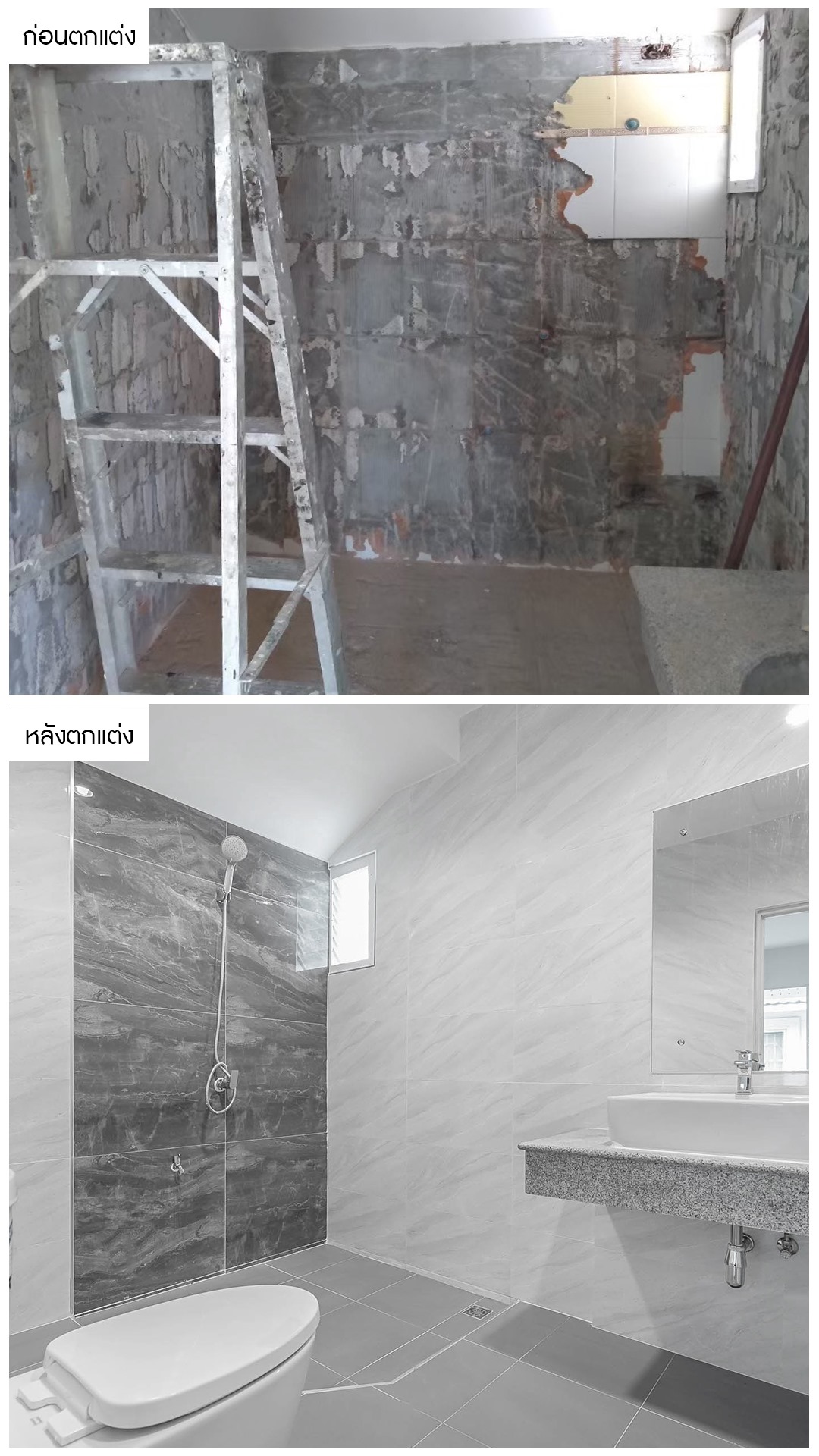 ห้องน้ำเราได้ปรับปรุงปูกระเบื้องให้ใหม่ทั้งหมด โดยใช้กระเบื้องลายหินอ่อน เพิ่มความสวยงาม และเหมาะกับโทนของบ้าน