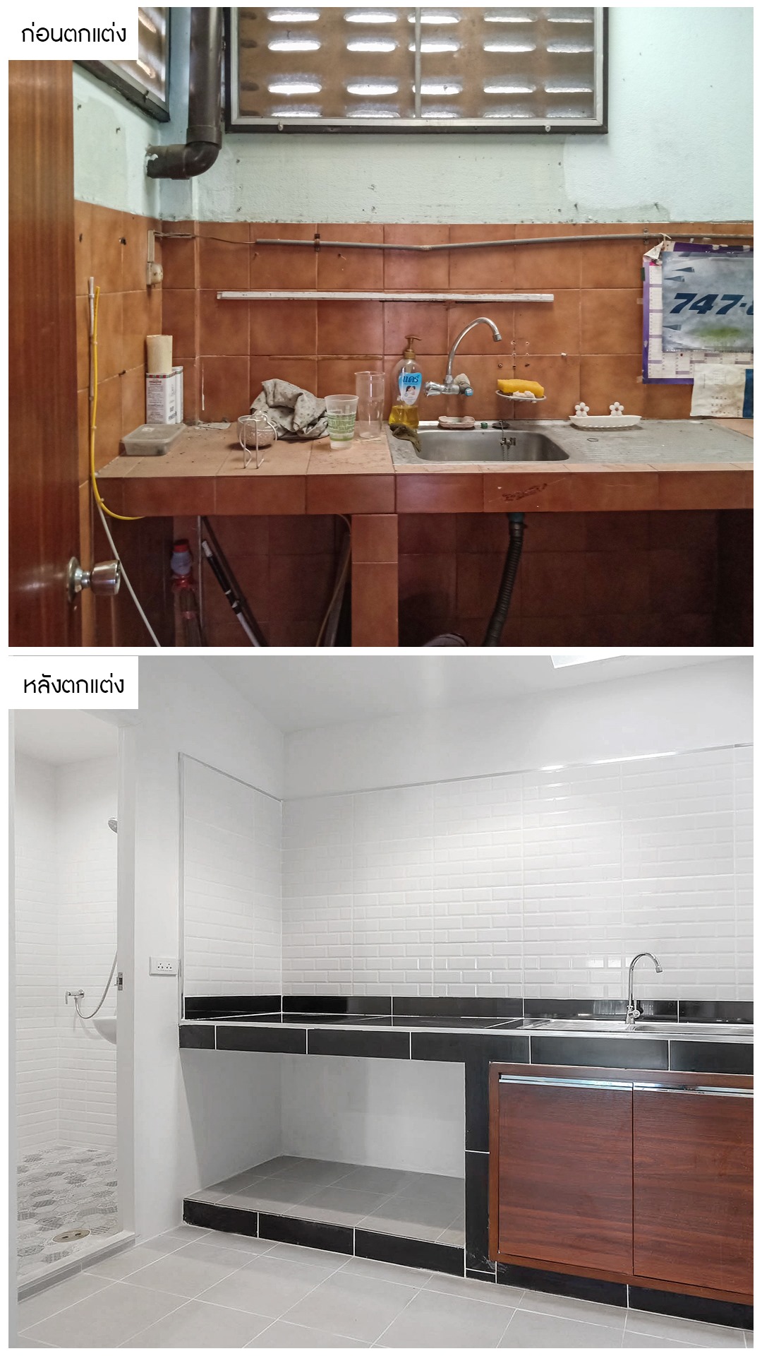 จากเดิมที่ครัวไม่พร้อมใช้งาน เราได้ทำการปรับปรุง/ต่อเติมให้ครบครันทุกฟังก์ชั่นทั้งครัวเคาน์เตอร์ ซิงค์ล้างจาน และแผงกันกระเด็น ที่ง่ายต่อการทำความสะอาด กระเบื้องและโทนสีภายในเน้นโทนสีขาวตัดดำ เพื่อให้ห้องครัวดูเรียบหรูขึ้น