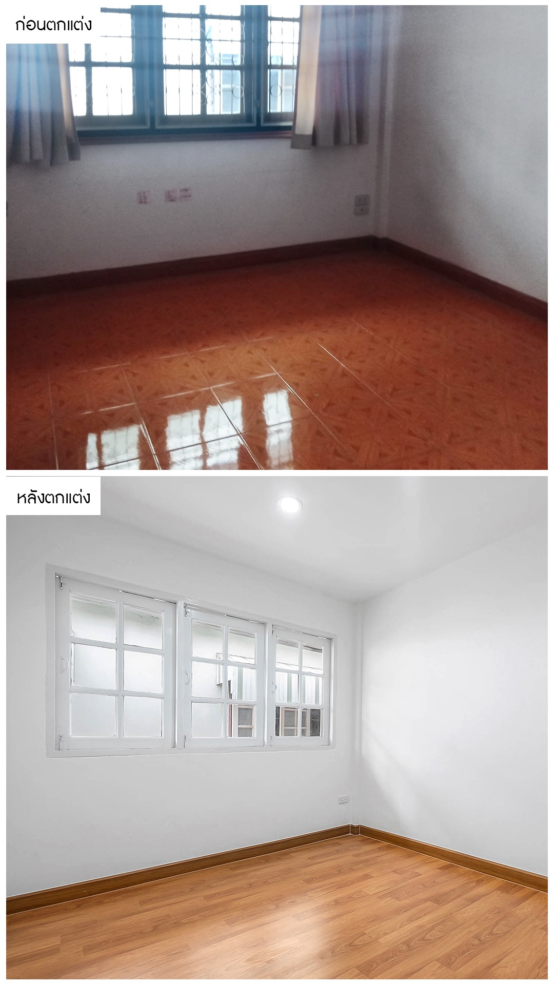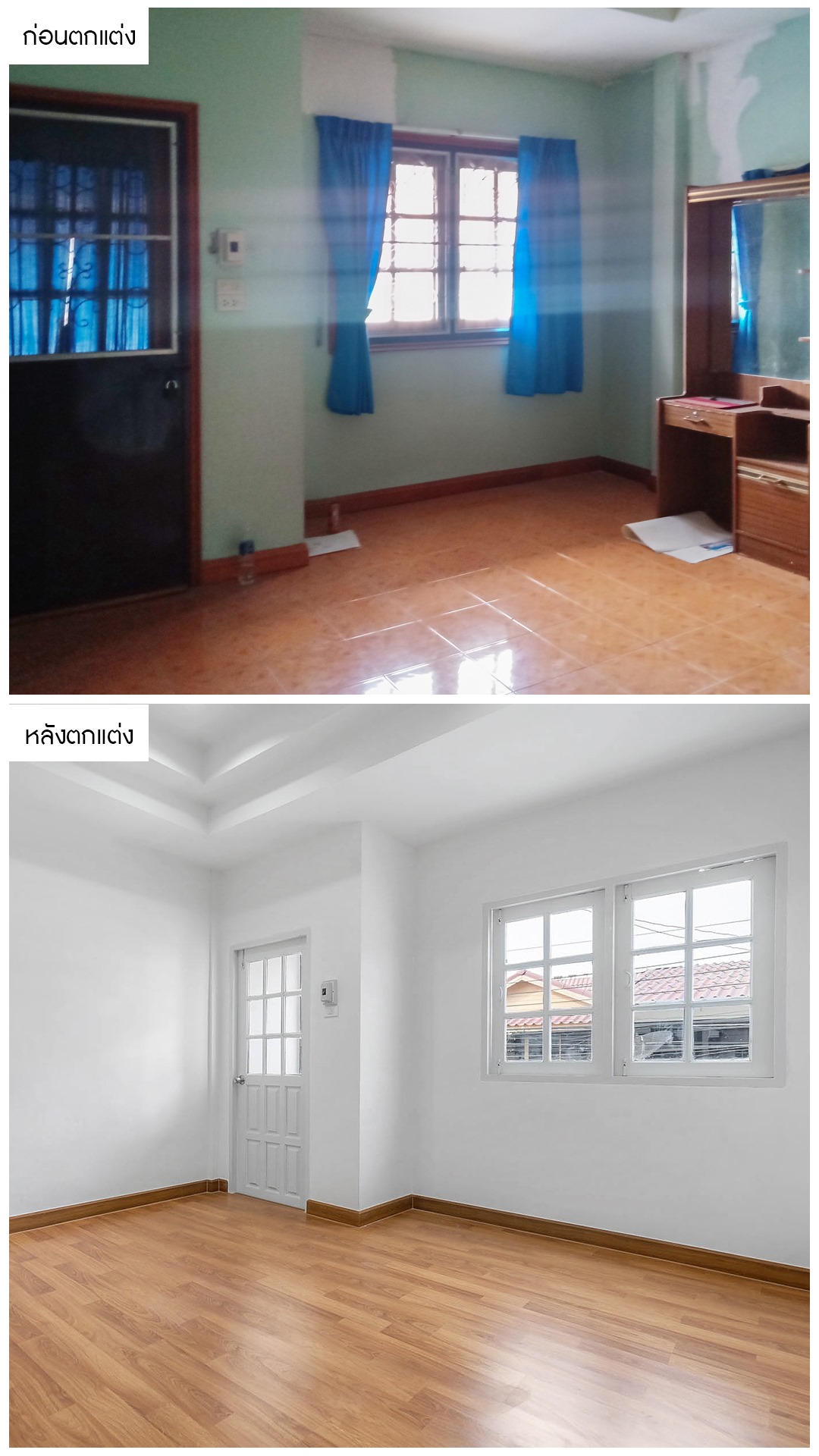 ห้องนอนกำหนดโทนสีภายในเป็นสีขาว ทำให้ห้องดูกว้างไม่อึดอัด พร้อมเปลี่ยนพื้นใหม่ ปูด้วยพื้นลามิเนต ที่มีความสวยงามและคงทน และเป็นที่นิยมใช้กับบ้านมือหนึ่ง