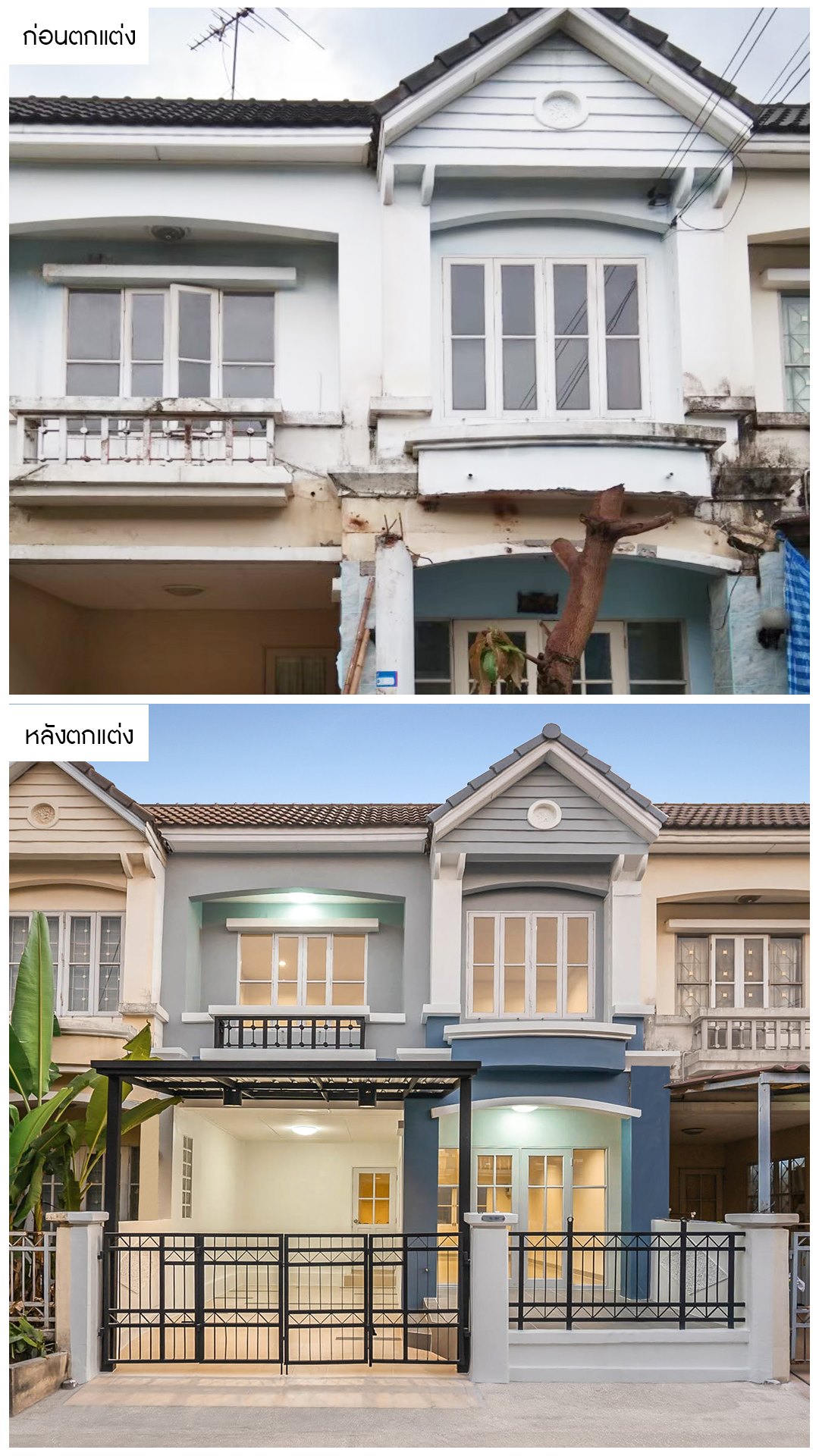 จากเดิมที่สภาพภายนอกดูเก่า เราได้ทำการเปลี่ยนสีหน้าบ้านให้มีความโมเดิร์น ทันสมัย หน้าบ้านเราจะเน้นความโปร่ง เพื่อให้มีแสง และลมธรรมชาติสามารถพัดเข้าทางหน้าบ้าน