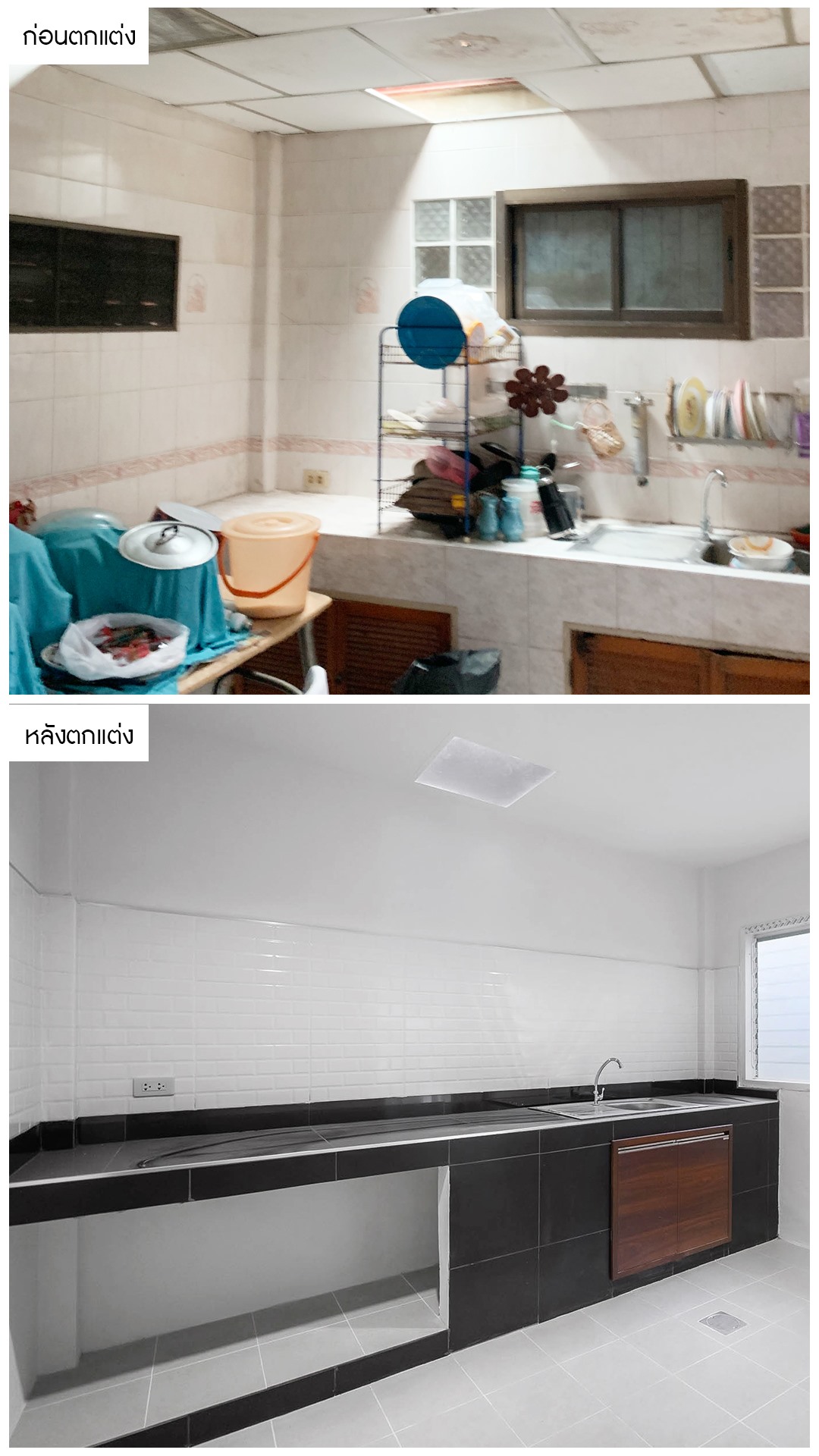จากครัวแบบเดิม เราได้ทำการตกแต่งใหม่ ให้เป็นครัวดีไซน์แบบโมเดิร์น ตอบโจทย์ครอบครัวทันสมัย ครบครันทั้งครัวเคาน์เตอร์ ซิ้งค์ล้างจาน มีช่องเก็บของที่กว้างขวาง และแผงกันกระเด็น ที่ง่ายต่อการทำความสะอาด กระเบื้องและโทนสีภายในเน้นโทนสีขาว เพื่อให้ห้องครัวดูโปร่งกว้าง และสะอาดตา