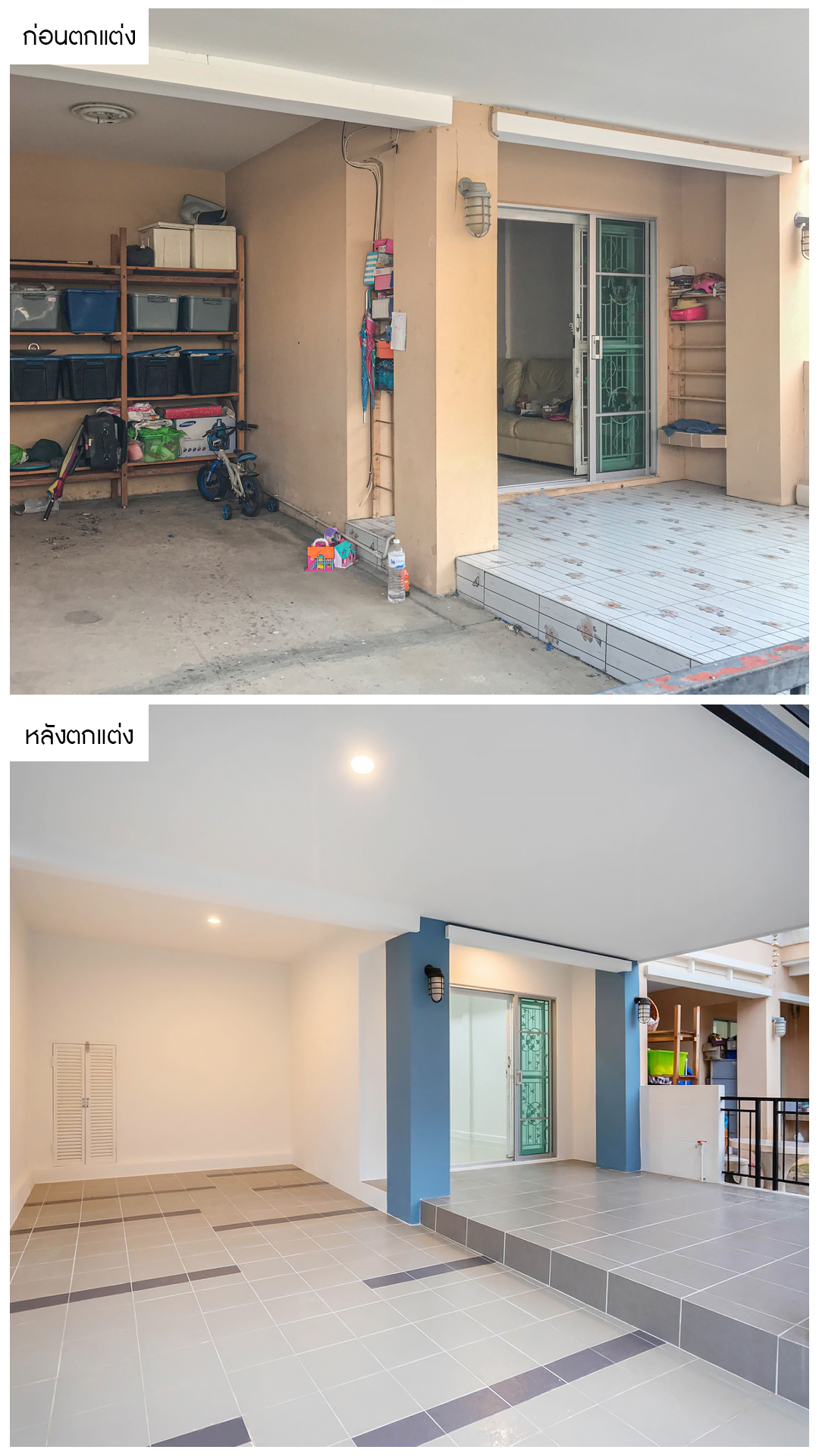 จากเดิมที่โรงรถดูรก ไม่พร้อมใช้งาน เราได้ปูพื้นด้วยกระเบื้องกันลื่น ลวดลายสุดโดดเด่นที่เป็นเอกลักษณ์สไตล์บ้านบางกอกที่ทั้งสวยงามและปลอดภัยแก่ผู้อยู่อาศัย โดยเน้นให้หน้าบ้านมีความโปร่ง กว้างมีแสงธรรมชาติและลมพัดผ่านครับ