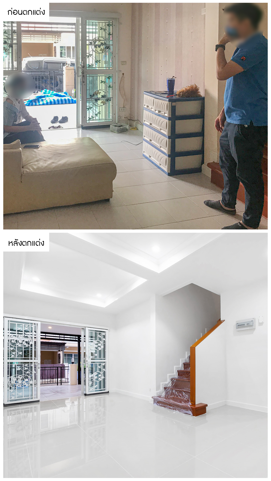 ภายในได้เปลี่ยนโทนสีใหม่ทั้งหมด โดยเน้นสีโทนขาวสว่าง ที่ให้ความรู้สึกโปร่ง กว้าง และบรรยากาศผ่อนคลายน่าอยู่อาศัยมากขึ้น พร้อมเปลี่ยนพื้นแบบเดิมให้เป็นพื้นแกรนิตโต้แผ่นใหญ่ที่สวยงามและเป็นที่นิยมปูภายในบ้านยุคใหม่ครับ พร้อมติดตั้งไฟดาวน์ไลท์ที่ทั้งสว่างและเพิ่มมิติให้บ้านมากยิ่งขึ้น
