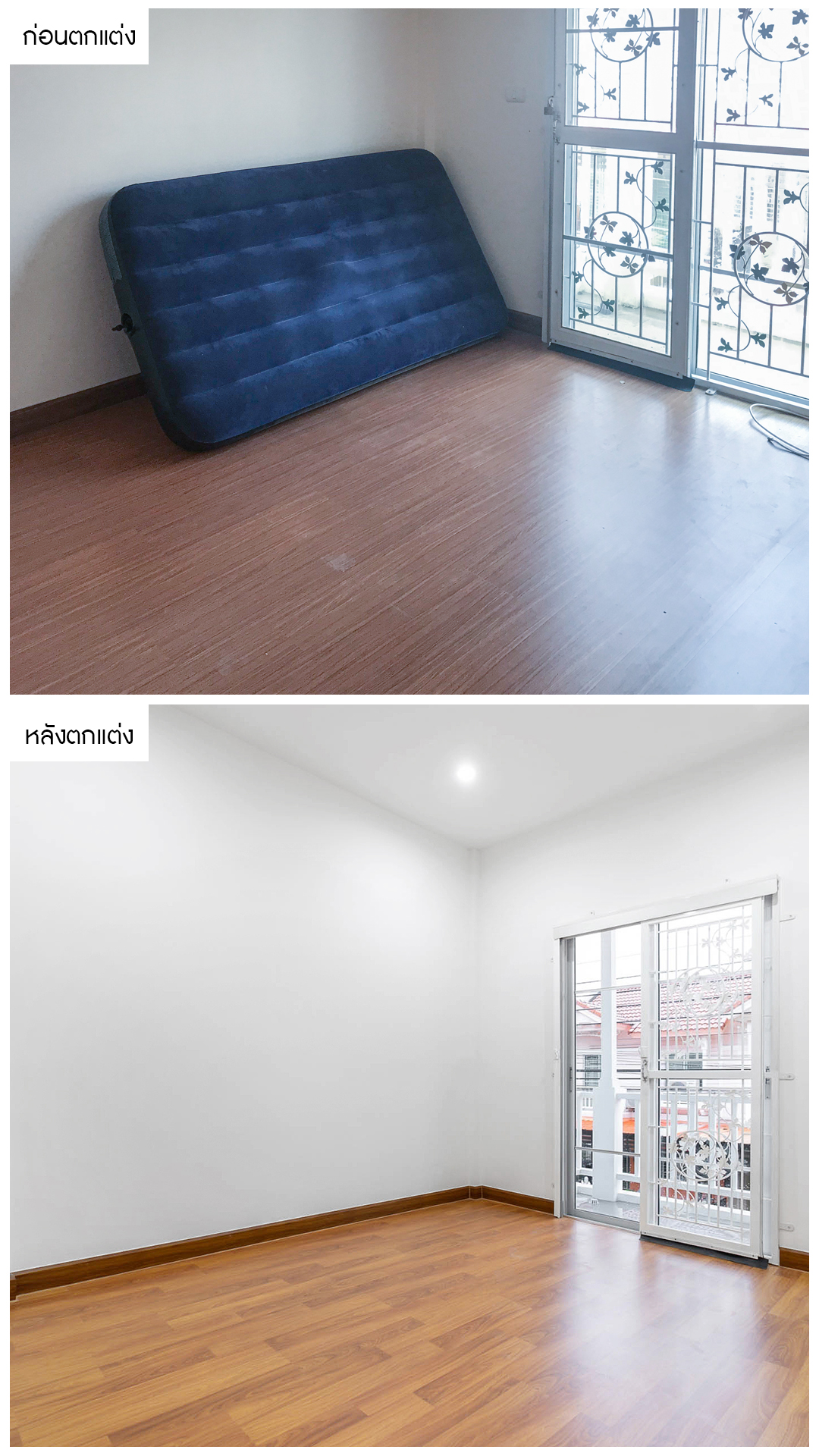 ห้องนอนที่สภาพดูเก่า เราได้เปลี่ยนให้เป็นพื้นลามิเนตที่ทั้งสวยงามและคงทน พร้อมเปลี่ยนโทนสีภายในห้องให้เป็นโทนสีขาว ดูสว่างและทำให้ห้องดูกว้างมากยิ่งขึ้น และติดตั้งไฟดาวน์ไลท์ที่ทั้งสว่างและเพิ่มมิติให้ห้องนอนน่าพักผ่อนมากยิ่งขึ้น