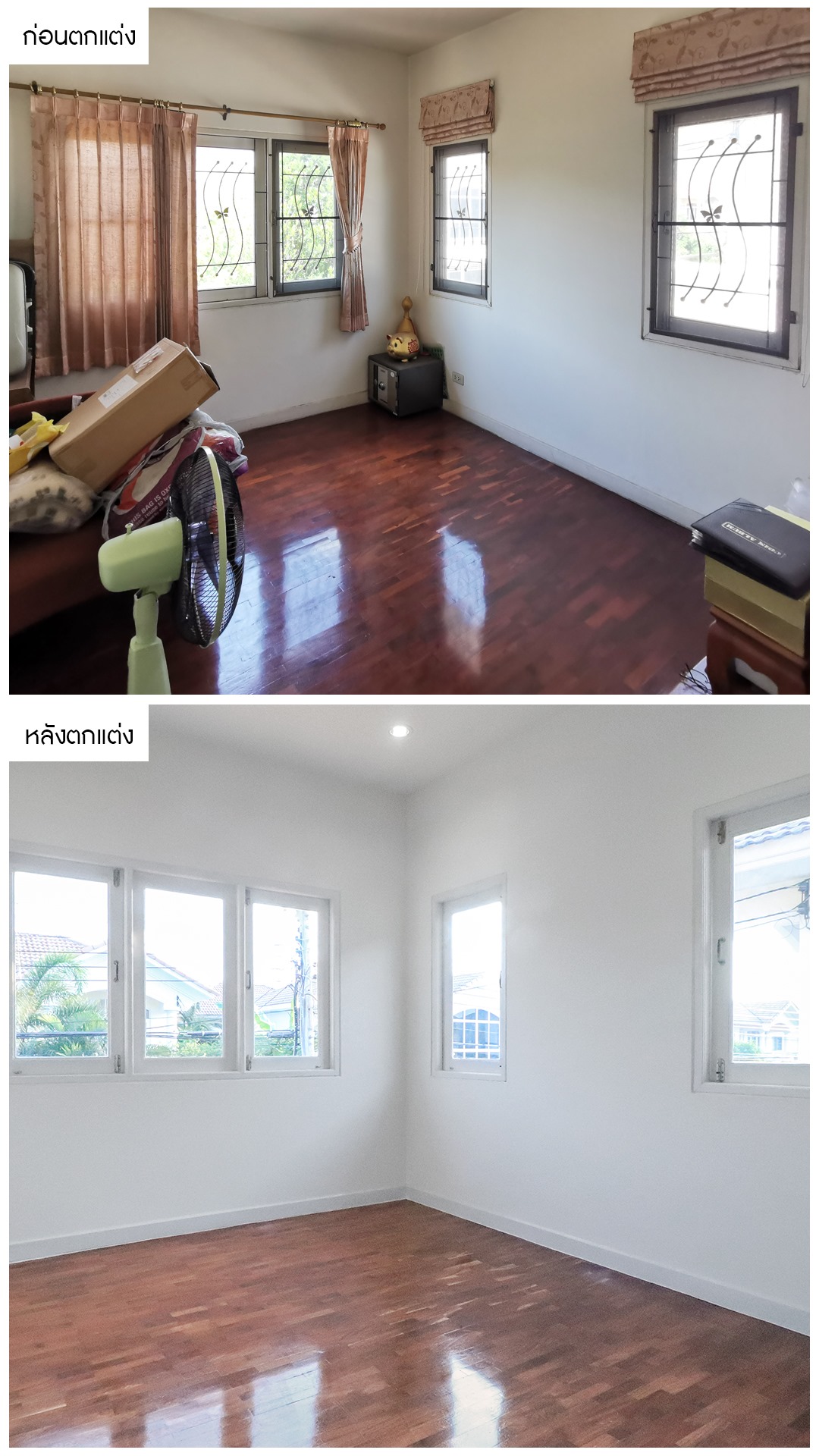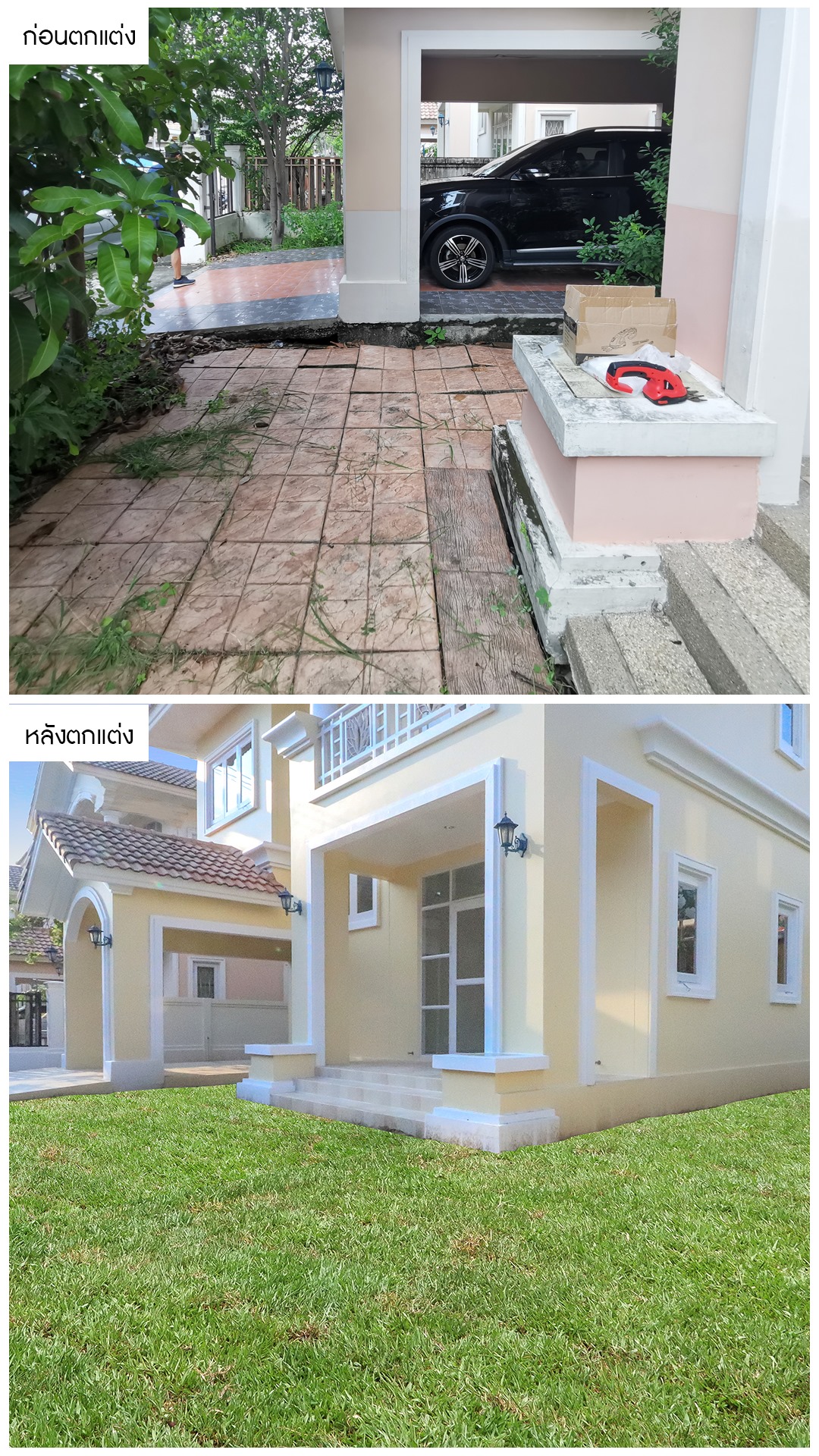 จากบ้านเดิมที่เคยรกทึบ มีต้นไม้บดบังทัศนียภาพ เราได้ทำการตัดต้นไม้ออก และเคลียร์พื้นที่หน้าบ้านให้โปร่งโล่ง เพื่อให้ลมสามารถพัดผ่านและเปิดรับแสงธรรมชาติได้มากขึ้น จากนั้นก็ทำการเปลี่ยนสีบ้าน ให้เป็นสีโทนสบายตา ดูทันสมัยและยังปรับทัศนียภาพรอบๆให้สวยงาม น่าอยู่อาศัยมากยิ่งขึ้น