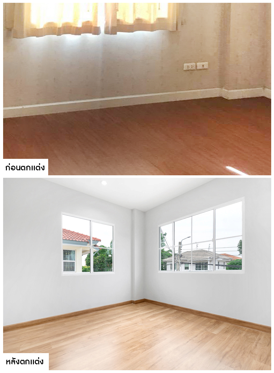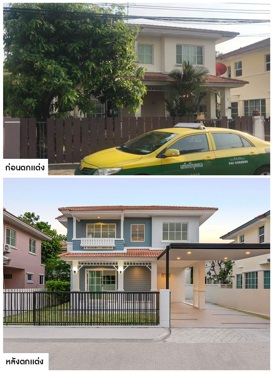 จากบ้านสภาพเดิมที่รกทึบและสีซีดจาง เราได้ทำการเคลียร์ในส่วนของหน้าบ้านให้ดูโปร่งโล่ง ปรับเปลี่ยนพื้นข้างบ้านให้เป็นสนามหญ้ารองรับทุกกิจกรรม พร้อมทาสีใหม่ทั้งหลังให้มีความสวยงาม ดูทันสมัยมากขึ้น และปรับทัศนียภาพรอบๆ เพื่อให้ตัวบ้านมีความโดดเด่นมากขึ้น