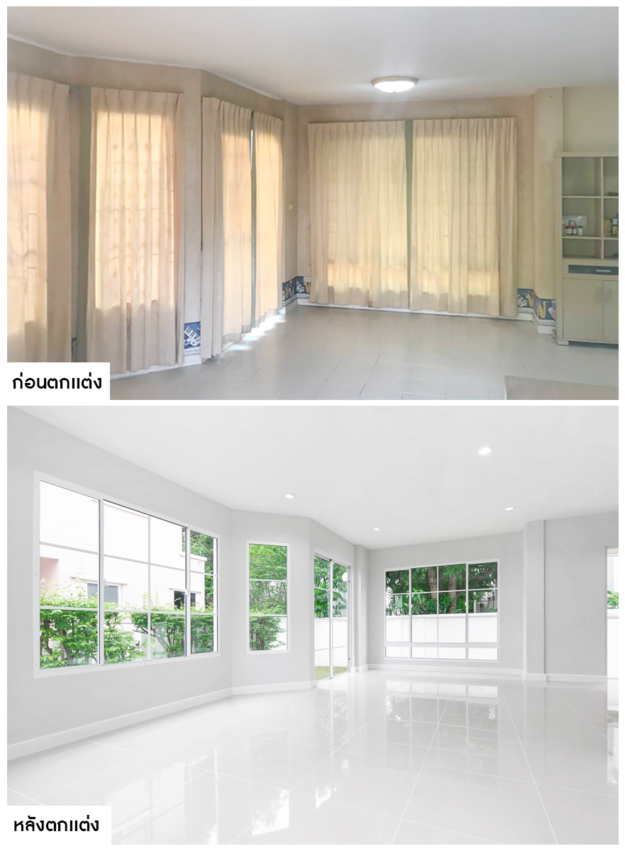 ภายในปูพื้นใหม่ด้วยกระเบื้องแกรนิตโต้ ที่มีความสวยงาม และง่ายต่อการทำความสะอาด นอกจากนั้นเรายังเปลี่ยนโทนสีภายในให้เป็นสีโทนขาวสว่าง ที่ให้รู้สึกผ่อนคลาย และโปร่งกว้างด้วยประตู/หน้าต่างบานสไลด์รอบบ้าน สามารถรับแสงธรรมชาติได้อย่างเต็มที่ และทำให้มีความโมเดิร์นมากขึ้น พร้อมเปลี่ยนแสงไฟเป็นแบบดาวน์ไลท์จากเพดานที่จะช่วยให้ความสว่าง และยังทำให้บ้านดูมีมิติยิ่งขึ้นด้วยครับ