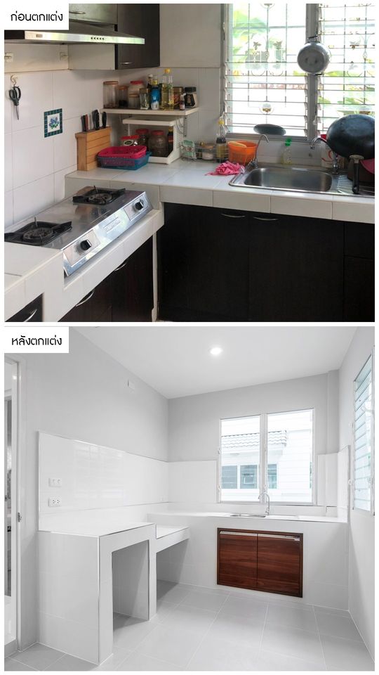 จากเดิมที่ห้องครัวเป็นครัวเคาน์เตอร์ดีไซน์เก่า เราได้ทำการตกแต่งต่อเติมครัวเคาน์เตอร์ให้สวยงามทันสมัยมากขึ้น พร้อมครบครันทั้งแผงกันกระเด็น ซิ้งล้างจาน จุดวางเตาแก๊ส ฯลฯ ครบครันทุกฟังก์ชั่นการใช้งานเลยครับ