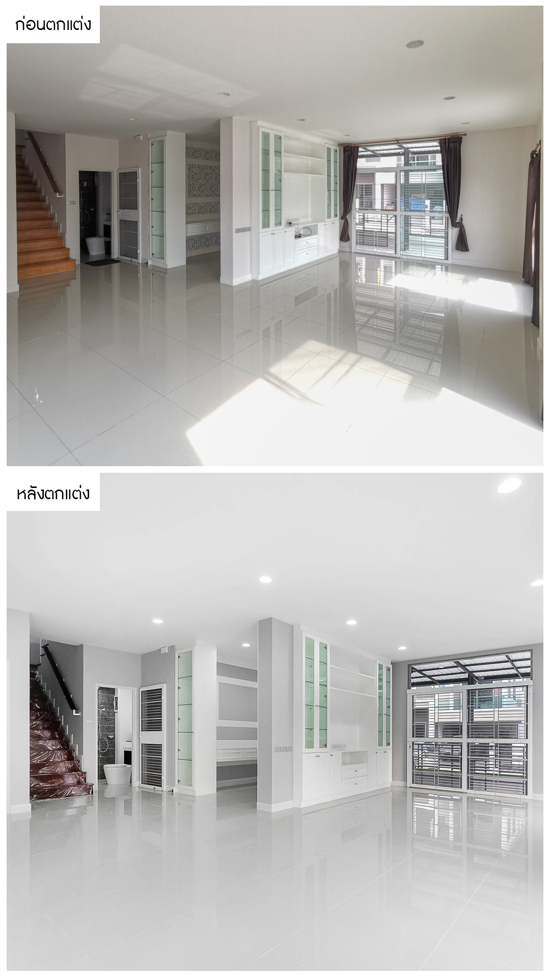 สภาพบ้านที่สีซีดจางเปลี่ยนแปลงไปตามกาลเวลา เราได้ทาสีใหม่ทั้งหลังแต่ยังคงโทนสีเดิม แต่เพิ่มเติมด้วยการตกแต่งให้โมเดิร์นมากขึ้นให้ตอบโจทย์คนรุ่นใหม่