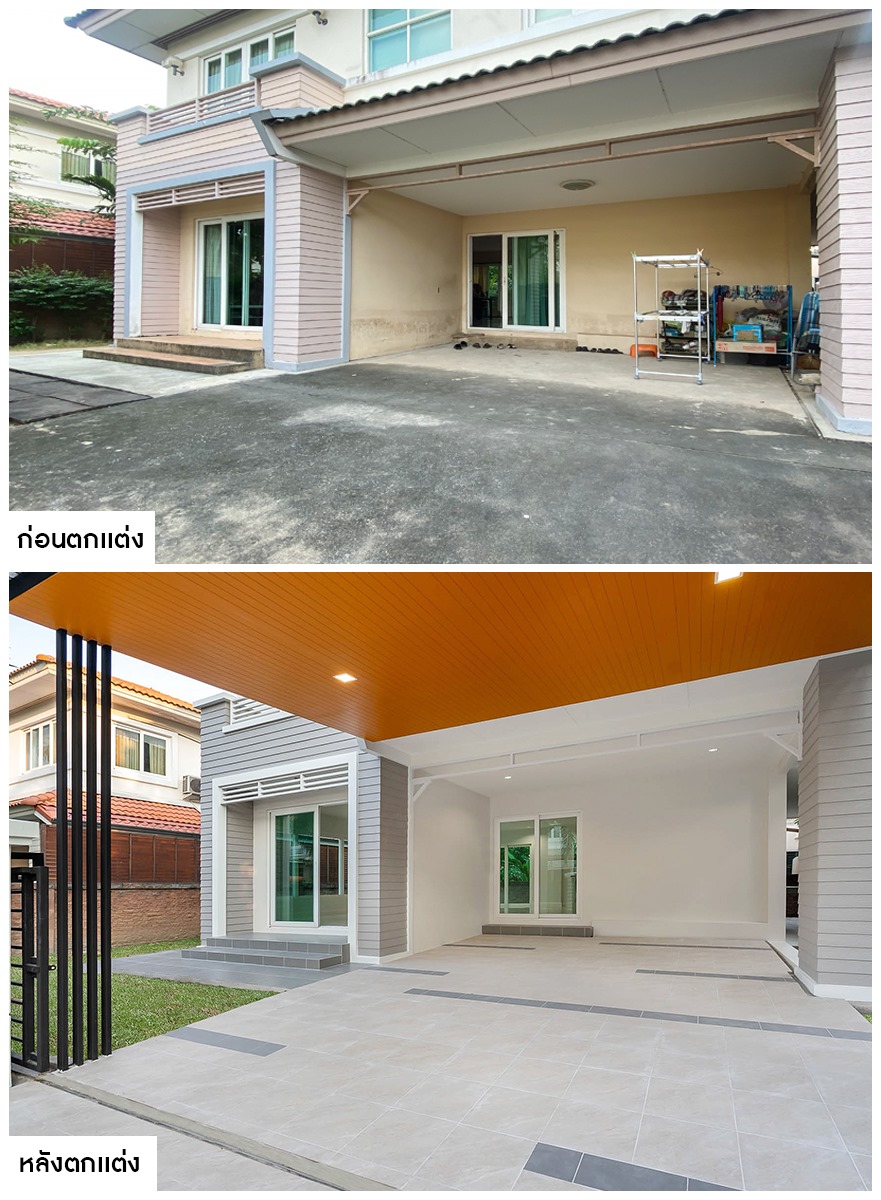 ในส่วนของโรงจอดรถ เราได้ปรับปรุงใหม่ทั้งหมด ทำการเคลียร์พื้นที่ให้มีความน่าอยู่อาศัย พร้อมปูกระเบื้องกันลื่นคุณภาพ ลวดลายเฉพาะของบ้านบางกอกฯ พร้อมหรูหราด้วยหลังคาระแนงไม้เฌอร่าสีส้มตัดกับโทนสีของบ้าน เพิ่มความโดดเด่นมากขึ้น