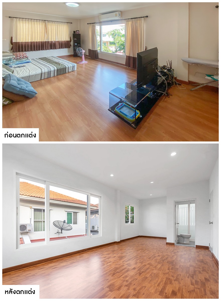 ห้องนอนใหญ่ ก็ได้รับการปรับปรุงใหม่ โดยทาสีภายในใหม่ทั้งหมดเป็นโทนสีขาว ช่วยให้รู้สึกผ่อนคลาย และปูพื้นให้เป็นลามิเนตที่ทั้งสวยงามและคงทน ปรับปรุงเพดานใหม่ให้เป็นแบบฝ้าเรียบพร้อมติดตั้งไฟดาวน์ไลท์ สร้างบรรยากาศสุดอบอุ่นและที่นิยมใช้กับบ้านยุคโมเดิร์นอีกด้วยครับ