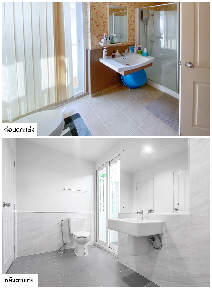 ห้องน้ำเก่า เราได้ทำการรีโนเวทใหม่ โดยกำหนดธีมหลักเป็นโทนสีขาว ที่จะช่วยให้ห้องน้ำดูโปร่งกว้าง สะอาดตา นอกจากนั้นเรายังคำนึงถึงผู้อยู่อาศัยที่ในการใช้พื้นกระเบื้องกันลื่น ที่ง่ายต่อการทำความสะอาด พร้อมคัดสรรสุขภัณฑ์ที่ได้มาตรฐาน สวยงาม และคงทน ครบครันทุกฟังก์ชั่นแบบพร้อมอยู่อาศัยเลยครับ