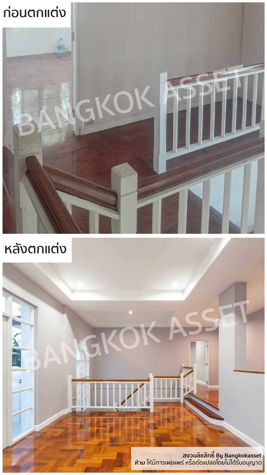 โถงบันไดและพื้นเราเปลี่ยนวัสดุให้ใหม่ เป็นพื้นไม้ปาร์เก้ ให้ความเป็นธรรมชาติ ดูอบอุ่น สบายตา มีความหนาและแข็งแรงมากยิ่งขึ้น