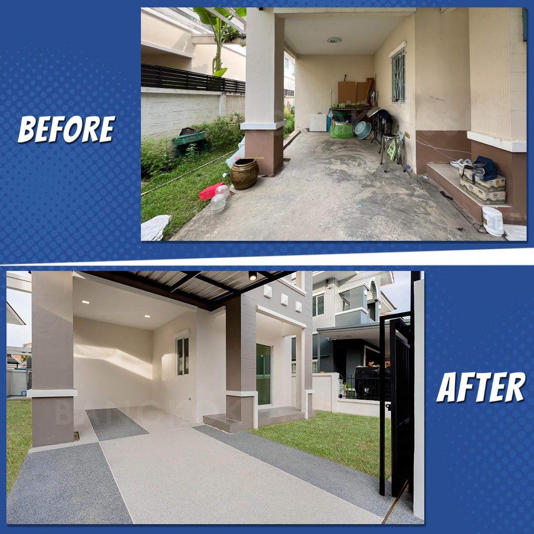 อัพเกรดพื้นที่จอดรถให้ใหม่เป็นพื้นทรายล้างที่เป็นเอกลักษณ์เฉพาะตัว ลดลายเข้ากับตัวบ้าน มีความแข็งแรง และมีผิวที่หยาบกันลื่นได้เป็นอย่างดี
