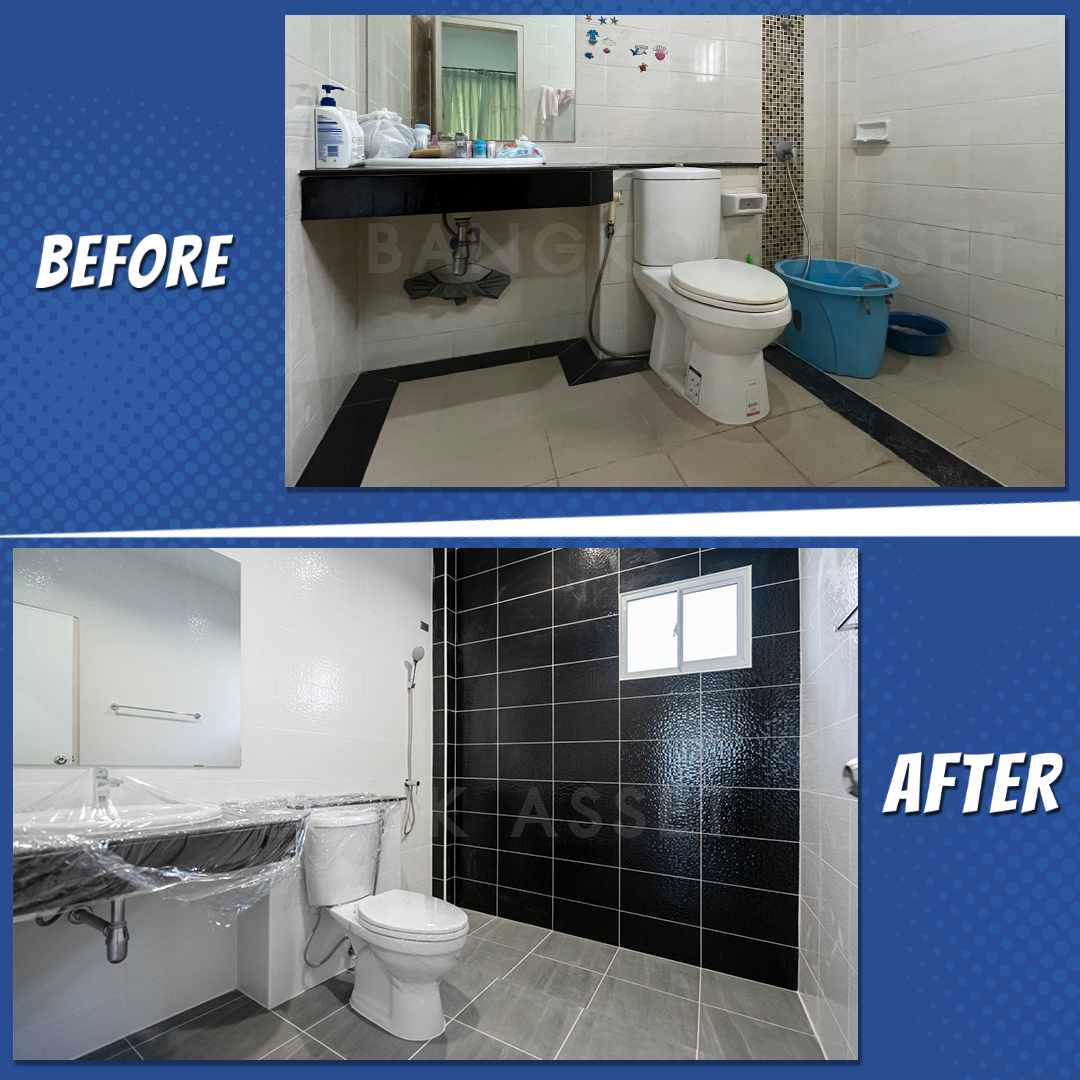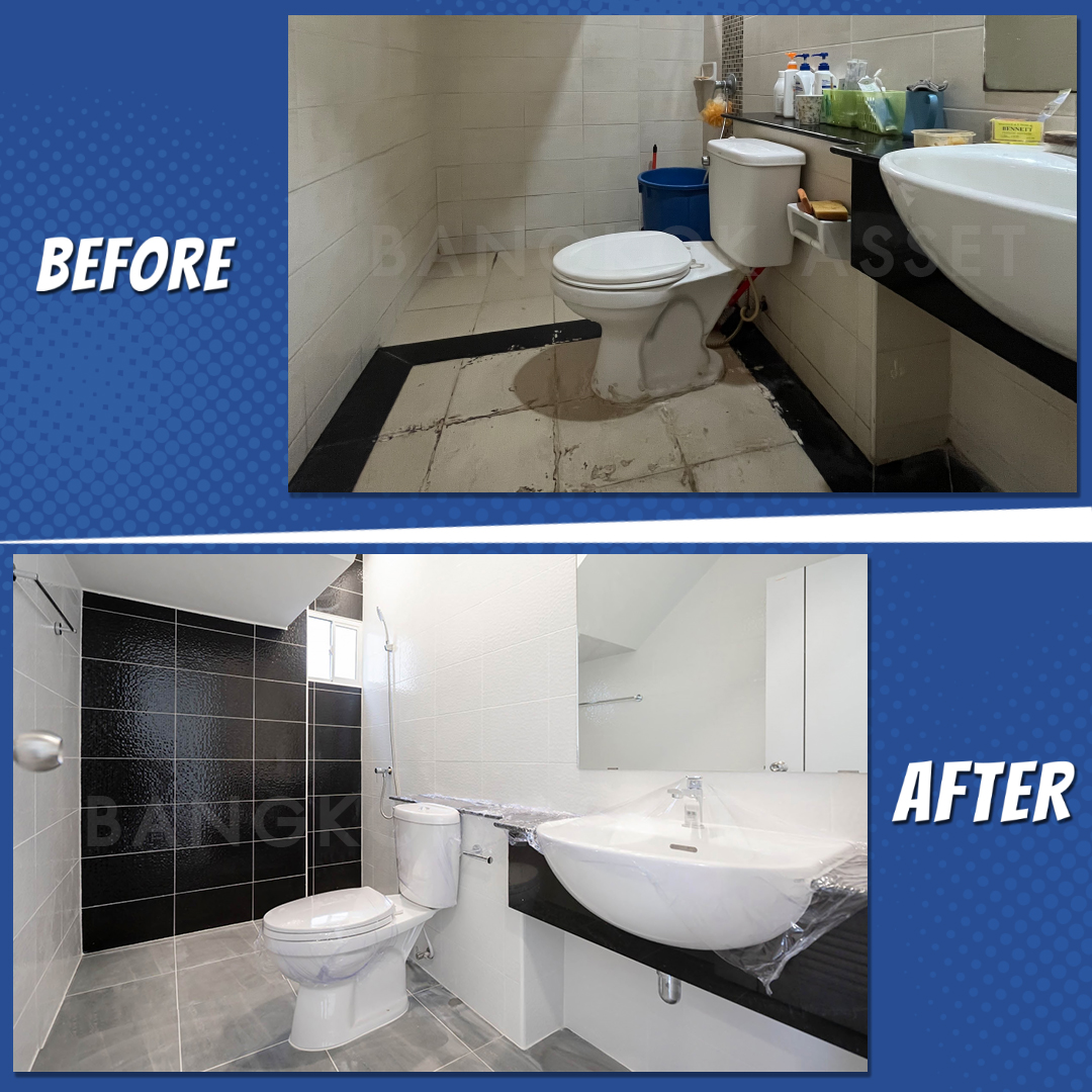 ห้องน้ำเราเปลี่ยนสุขภัณฑ์รวมถึงอุปกรณ์ต่าง ๆ ใหม่ทั้งหมด เปลี่ยนกระเบื้องผนัง และเปลี่ยนกระเบื้องพื้นแบบกันลื่นเพื่อความปลอดภัย นอกจากวัสดุที่เปลี่ยนให้ใหม่หมดแล้ว เรื่องของระบบระบายน้ำ และระบบไฟฟ้าเราก็ดูแล ทดสอบให้พร้อมใช้งานได้อย่างดี