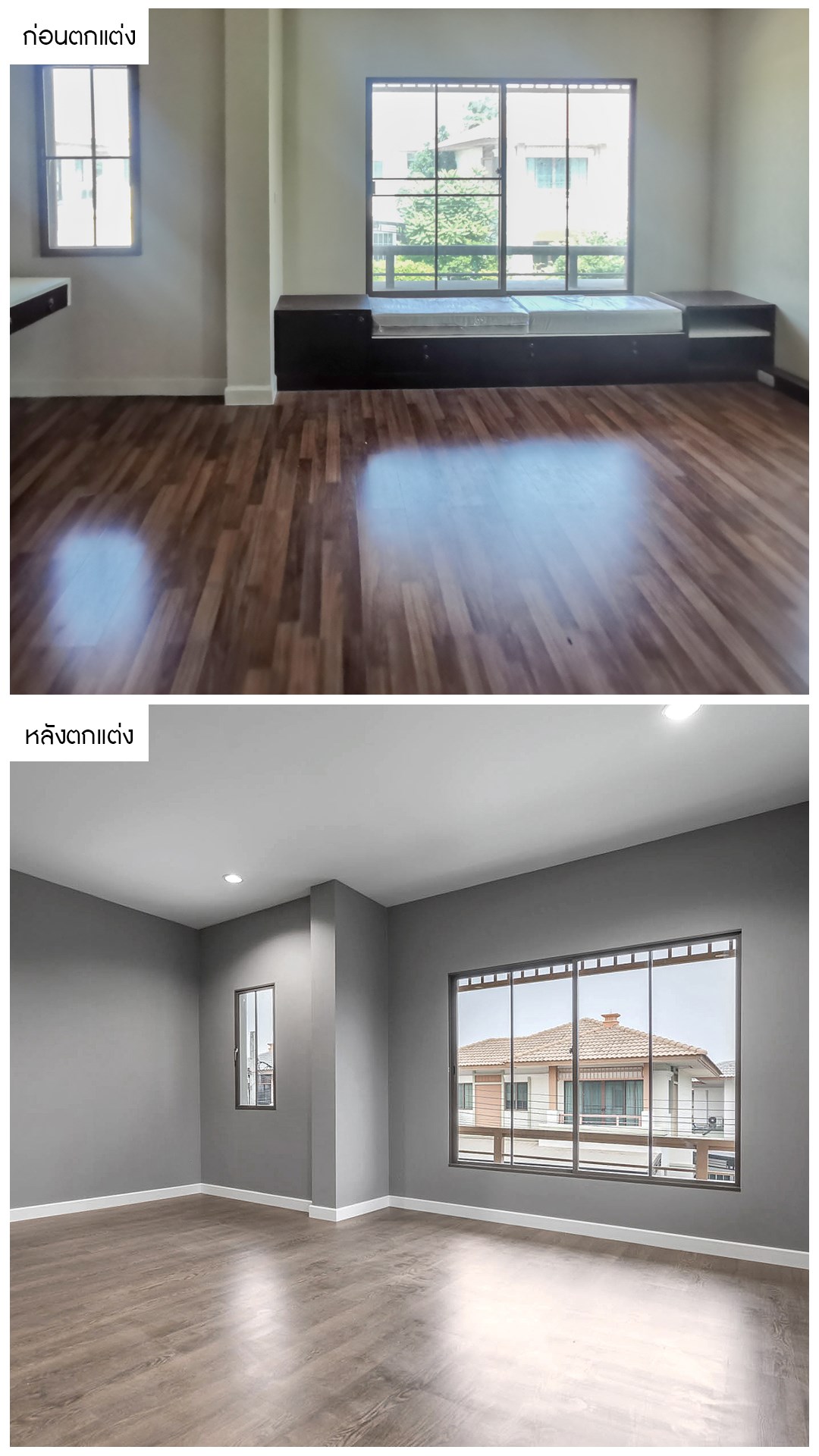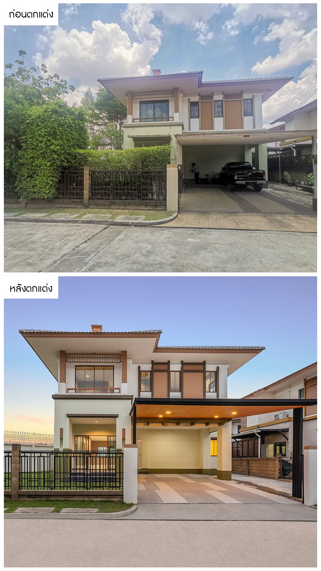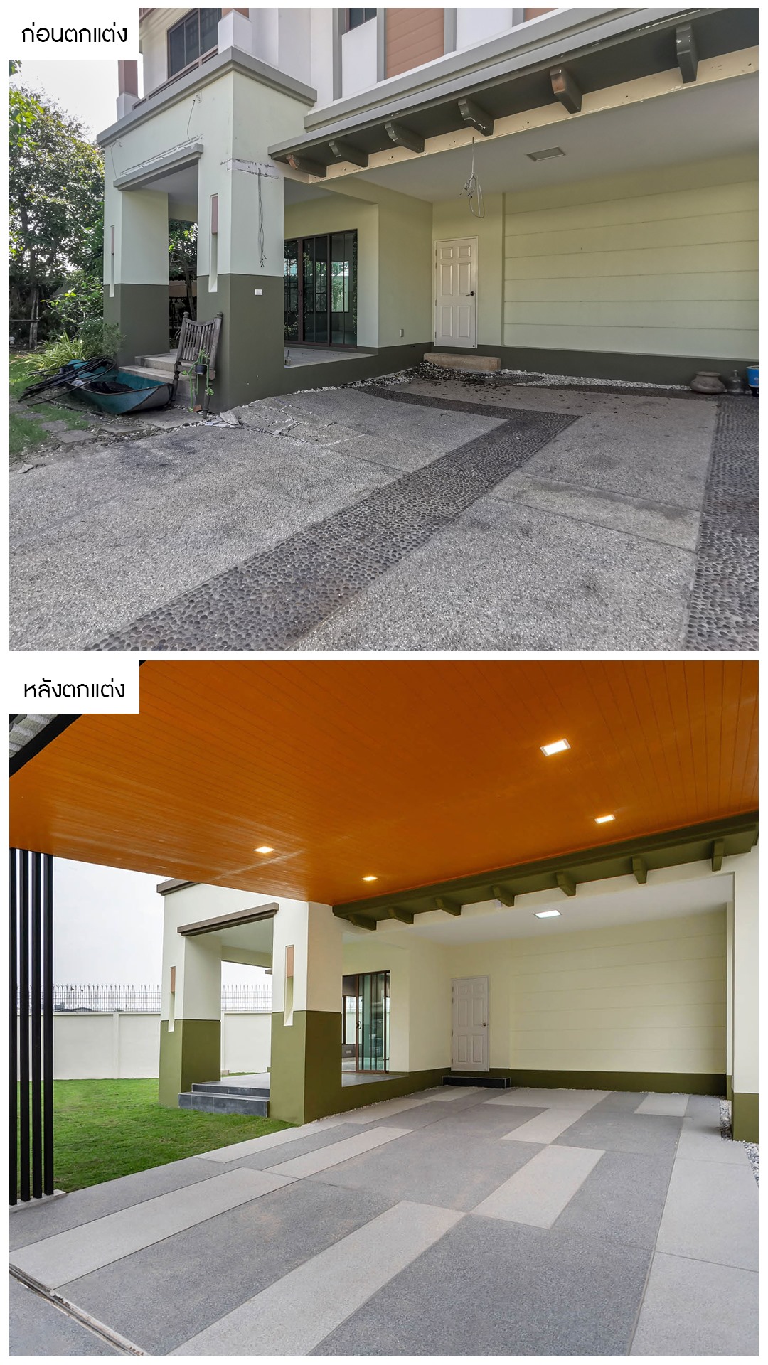 แค่หน้าบ้านก็เห็นถึงความแตกต่างอย่างชัดเจนเลยครับ จากเดิมที่บ้านมีสภาพเก่า มีต้นไม้ขึ้นรกทึบ เราได้ทำการเคลียร์พื้นที่หน้าบ้านให้โปร่งโล่ง ทำพื้นที่ข้างบ้านเป็นสนามหญ้าที่สามารถทำกิจกรรมในครอบครัวได้หลากหลายและ เปลี่ยนโทนสีบ้านเป็นโทนอบอุ่น ทำให้บ้านดูสว่าง และสามารถรับลมธรรมชาติได้ผ่านทางหน้าบ้านได้อย่างเต็มที่