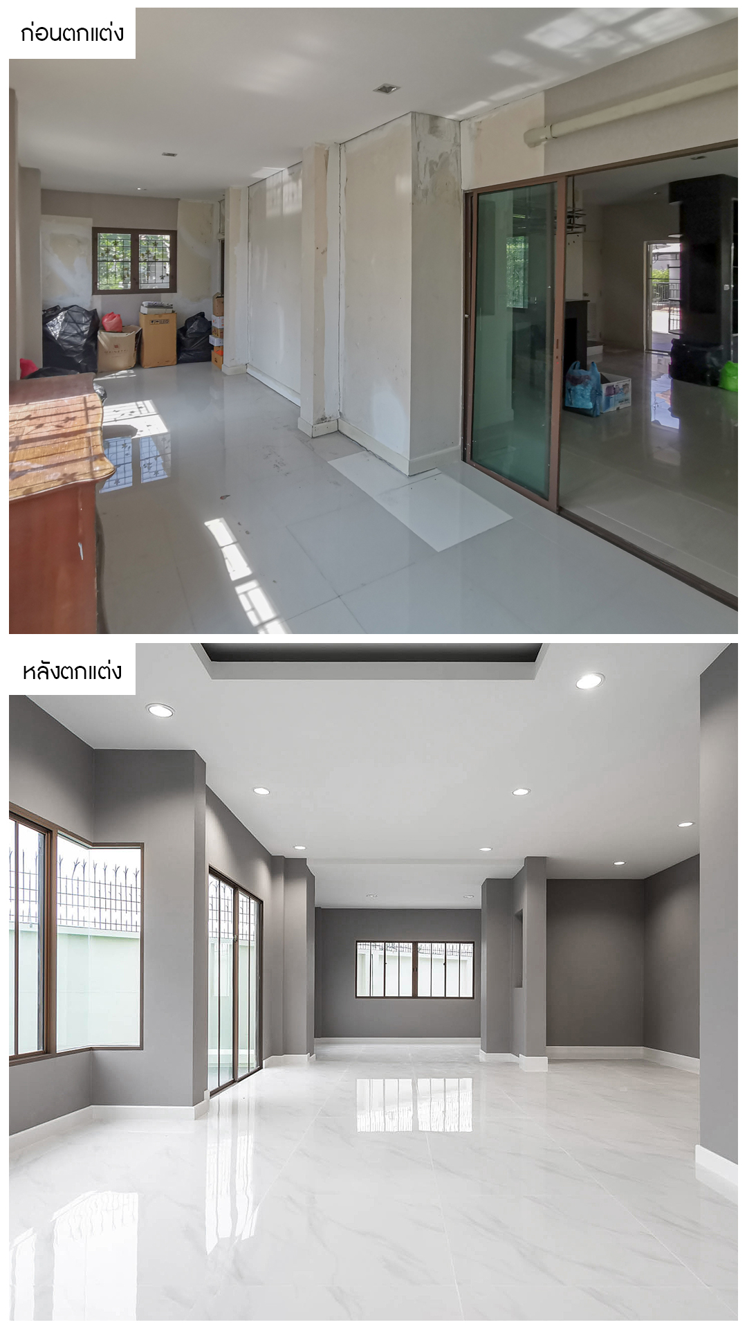 ภายในโถงชั้น 1 ที่เราตกแต่งให้เป็นโทนขาวสว่างตัดเทาที่จะเพิ่มความอบอุ่นและดูทันสมัยให้กับบ้าน สัมผัสได้ถึงความโปร่งกว้าง พร้อมปูพื้นด้วยกระเบื้องแกรนิตโต้แผ่นใหญ่ ที่มีรอยต่อน้อย ให้สัมผัสเหมือนหินอ่อน นอกจากนั้นเรายังแบ่งโซนครัวให้อีกด้วยครับ ซึ่งจะกั้นด้วยประตูกระจกบาน Slide ช่วยแบ่งพื้นที่เป็นสัดส่วน และในส่วนของเพดาน ก็ปรับปรุงให้เป็นแบบฝ้าเรียบที่ทันสมัย พร้อมตกแต่งด้วยไฟดาวน์ไลท์ทั้งหลัง สร้างบรรยากาศอบอุ่น ให้บ้านเป็นบ้านอย่างแท้จริงครับ