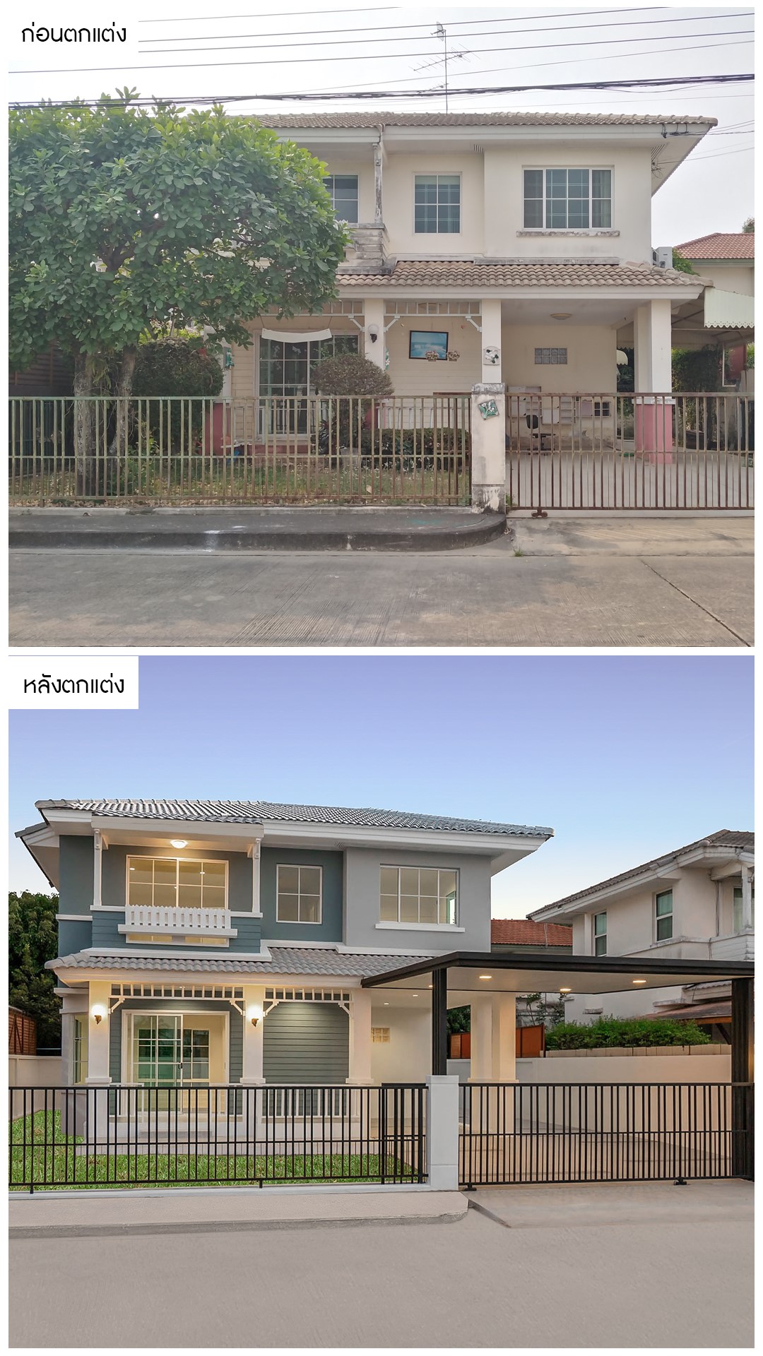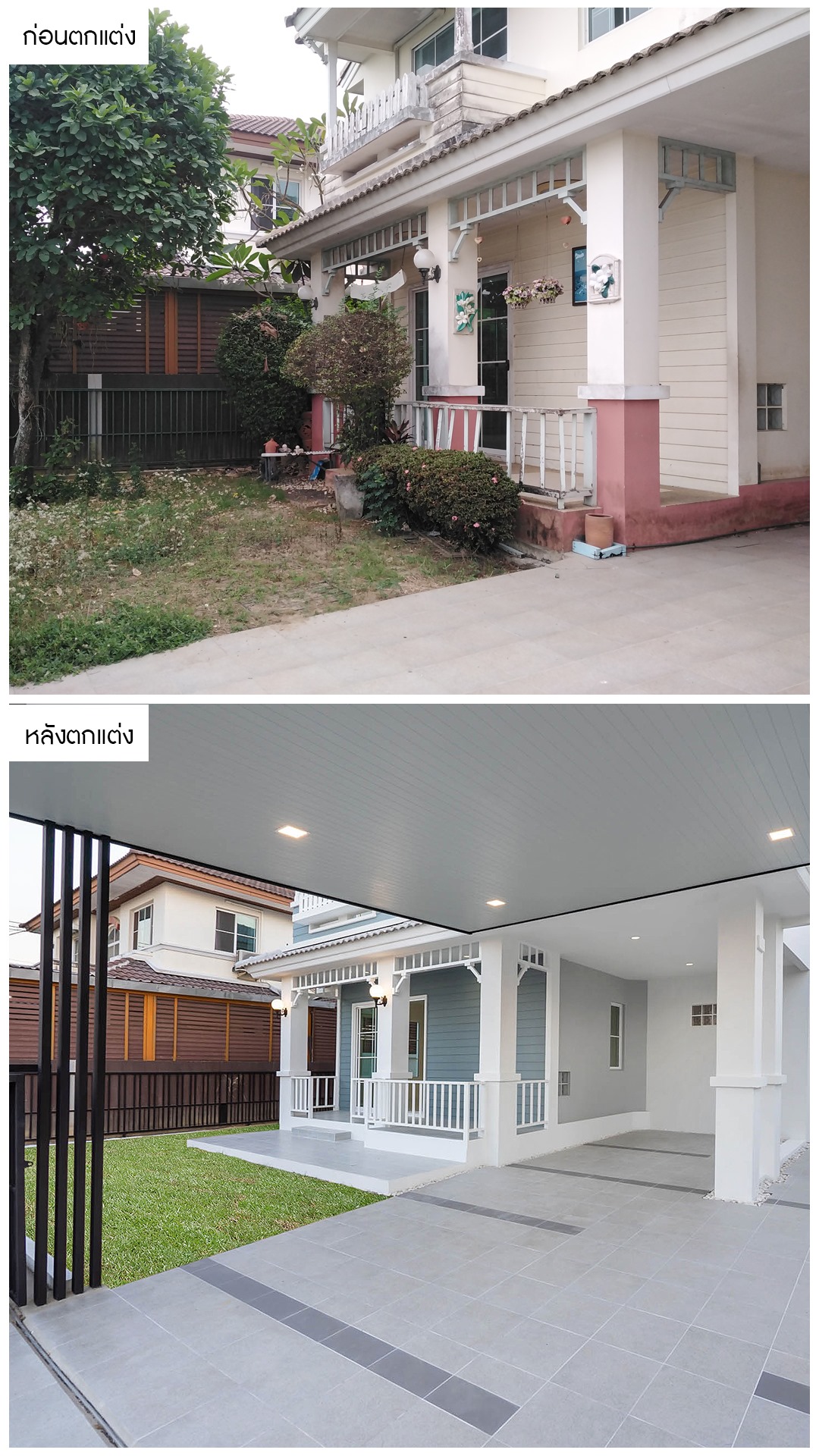 จากบ้านสภาพเดิมที่ดูโทรม และสีซีดจาง เราได้ทำการเคลียร์ในส่วนของหน้าบ้านให้ดูโปร่งโล่ง พร้อมทาสีใหม่ให้มีความสดใส และปรับทัศนียภาพรอบๆ เพื่อให้ตัวบ้านมีความโดดเด่น สวยงาม และน่าอยู่อาศัยมากขึ้น
