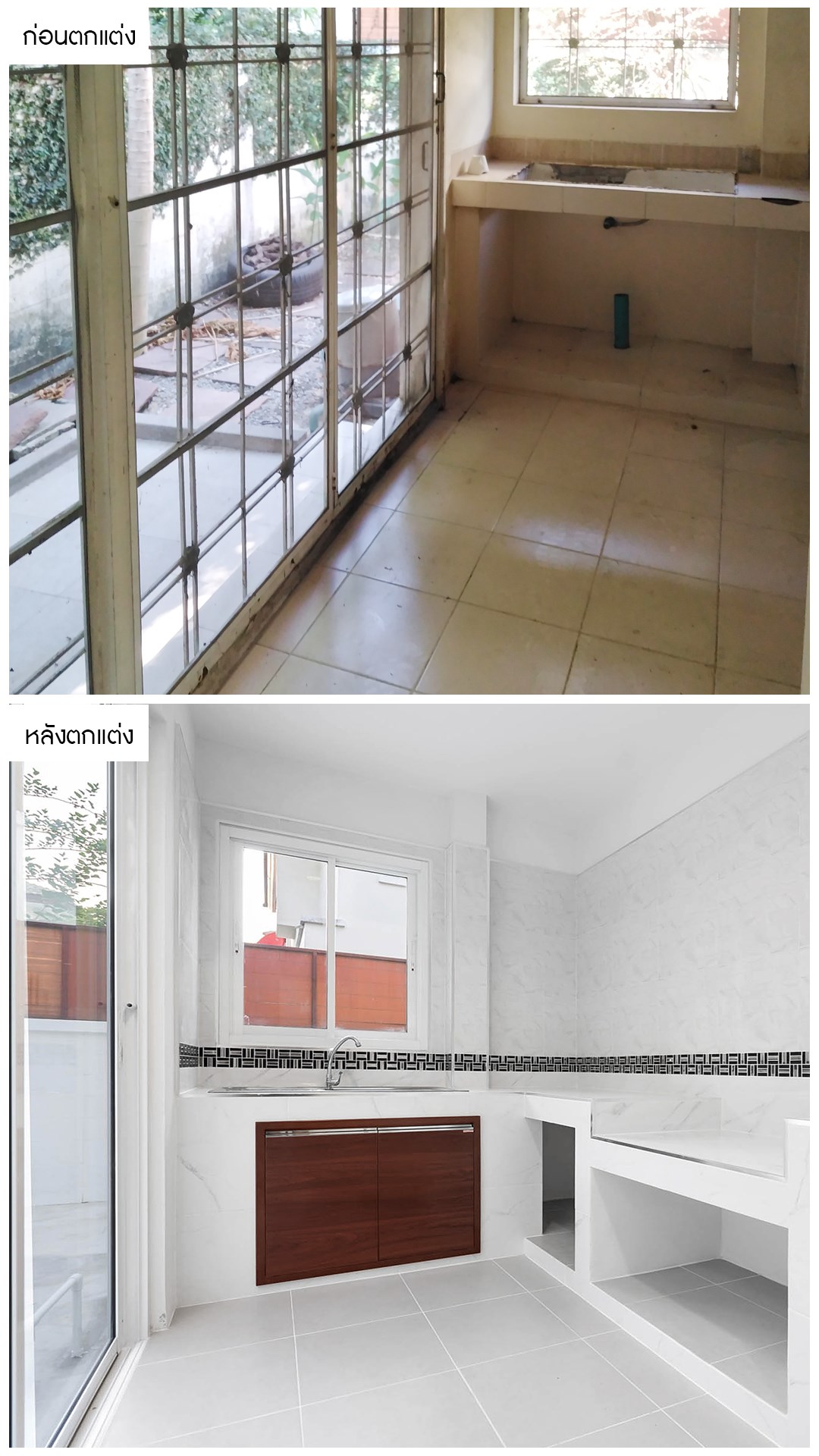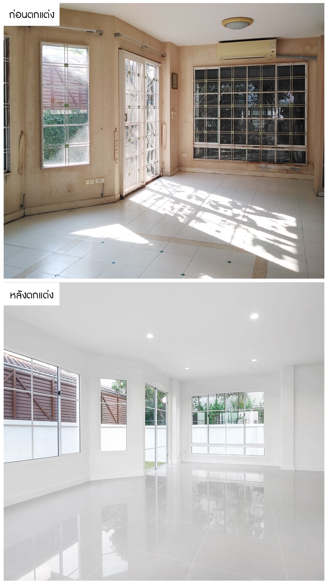 ภายในปูพื้นใหม่ด้วยกระเบื้องแกรนิตโต้ ที่มีความสวยงาม และง่ายต่อการทำความสะอาด นอกจากนั้นเรายังเปลี่ยนโทนสีภายในให้เป็นสีโทนสว่าง ที่ให้รู้สึกอบอุ่น และโปร่งกว้างด้วยประตู/หน้าต่างบานสไลด์ ทำให้มีความโมเดิร์นมากขึ้น พร้อมเปลี่ยนแสงไฟเป็นแบบดาวน์ไลท์จากเพดานที่จะช่วยให้ความสว่าง และยังทำให้บ้านดูมีมิติยิ่งขึ้นด้วยครับ