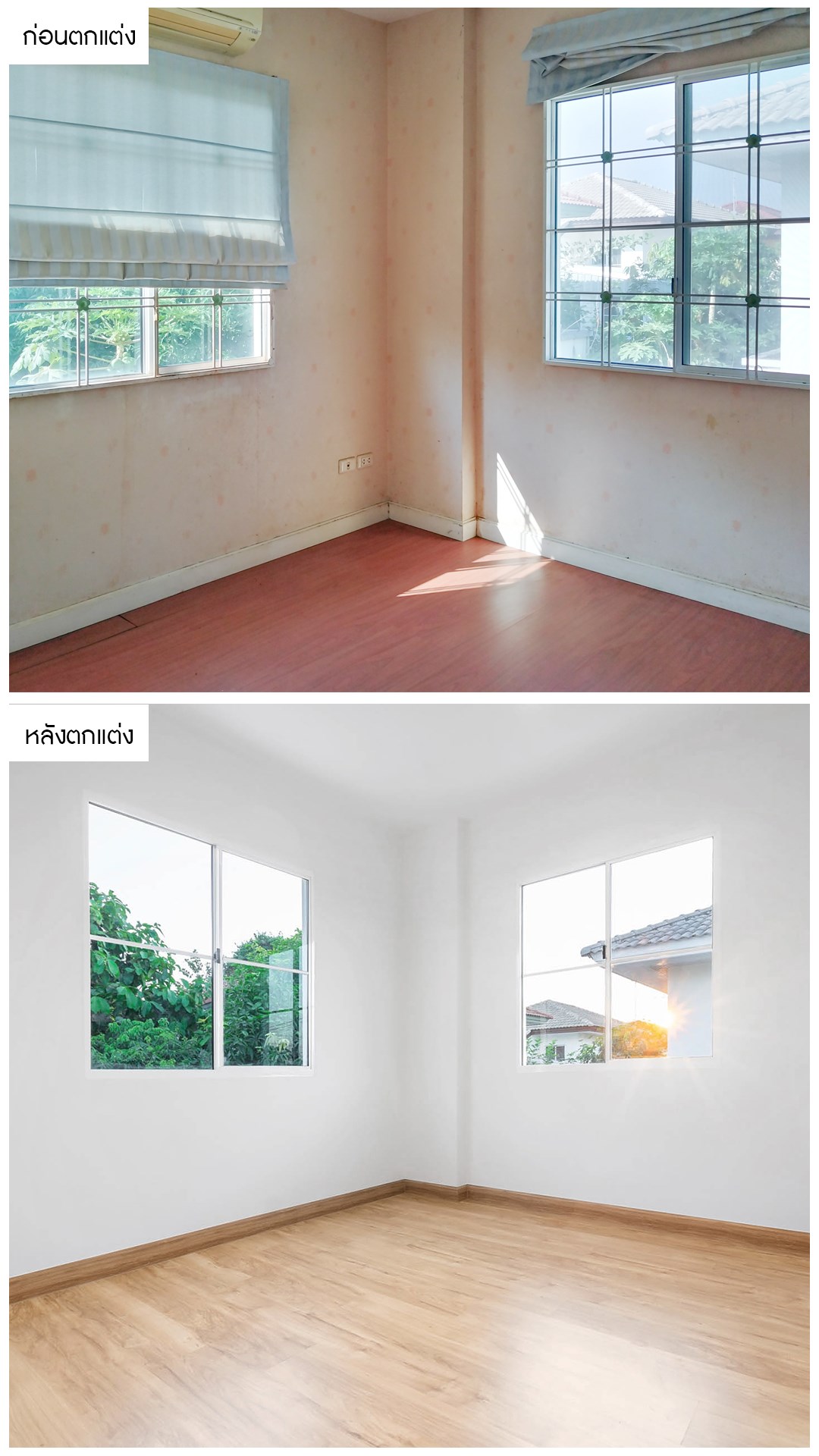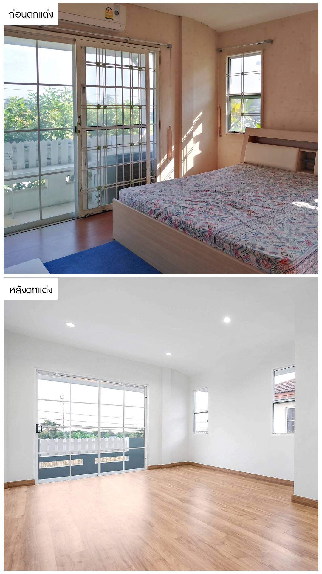 Master bedroom กว้างขวางด้วยประตู/หน้าต่างบานสไลด์ พร้อมเปลี่ยนพื้นใหม่เป็นพื้นลามิเนต ที่มีความสวยงามและทนทาน พร้อมทาสีใหม่โดยเลือกใช้สีขาว ที่ทำให้ห้องดูสว่าง และให้ความรู้สึกอบอุ่นมากขึ้น