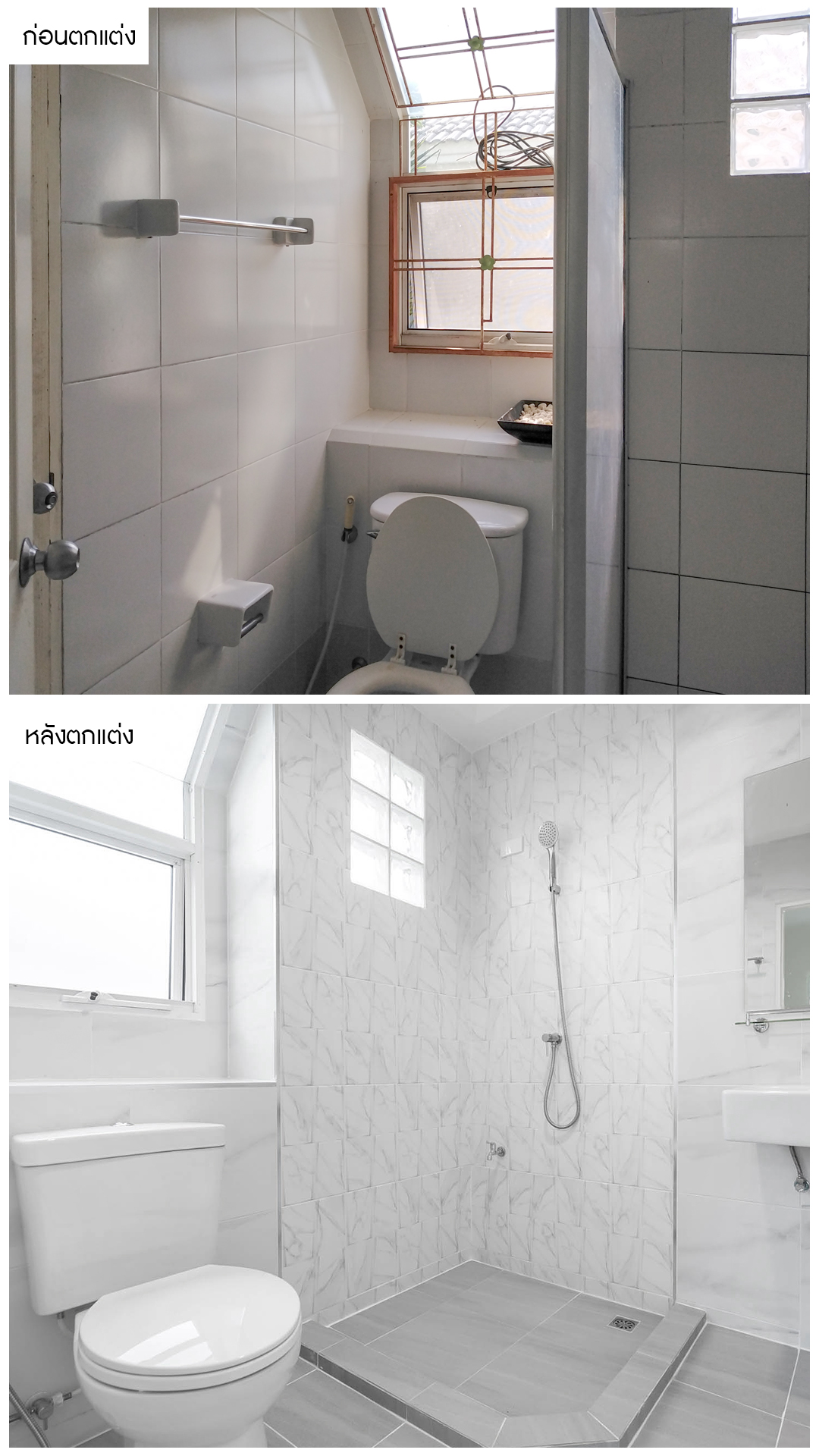 ครบครันทุกฟังก์ชั่น แบบพร้อมอยู่อาศัยกันเลยครับ มีช่องหน้าต่างที่ช่วยให้แสงธรรมชาติเข้าถึง นอกจากนั้นยังช่วยให้อากาศภายในถ่ายเท ทำให้ห้องน้ำมีความโปร่ง โล่งยิ่งขึ้น พร้อมตกแต่งสวยโดยเลือกวัสดุคุณภาพดี ครบครันทั้งอ่างล้างหน้า ฝักบัว กระเบื้องกันลื่น ในส่วนของผนัง เราก็ปูกระเบื้องตั้งแต่พื้นจรดเพดาน เพื่อให้ง่ายต่อการทำความสะอาด