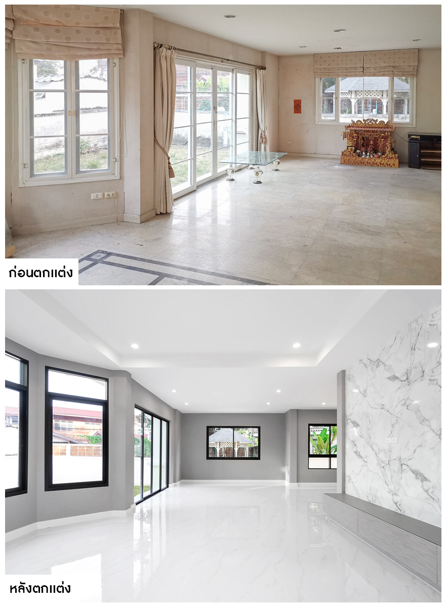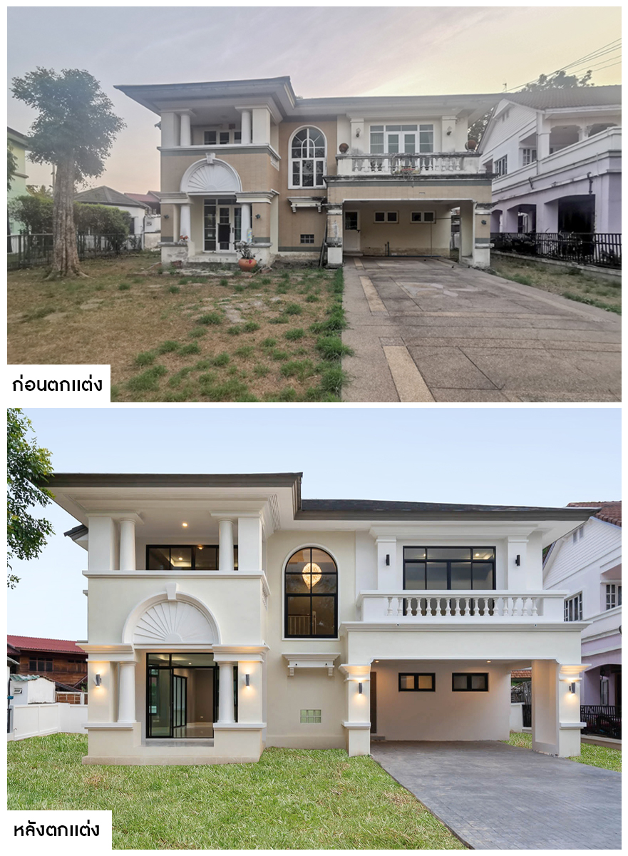 จากบ้านเดิมที่เคยมีสภาพเก่า ดูทรุดโทรม เราได้ทำการปรับปรุงใหม่ทั้งหมด โดยการเคลียร์พื้นที่บริเวณบ้านให้โปร่งโล่ง เพื่อให้ลมสามารถพัดผ่านและเปิดรับแสงธรรมชาติได้มากขึ้น  และเปิดพื้นที่สนามหญ้าให้กลับมาทำกิจกรรมได้อีกครั้ง  จากนั้นทำการทาสีใหม่ทั้งหลัง กำหนดเป็นสีโทนสว่างขาวนวล ดูอบอุ่นสบายตา ปรับปรุงรั้วใหม่ให้ดูสวยงามทันสมัยรับกับตัวบ้าน