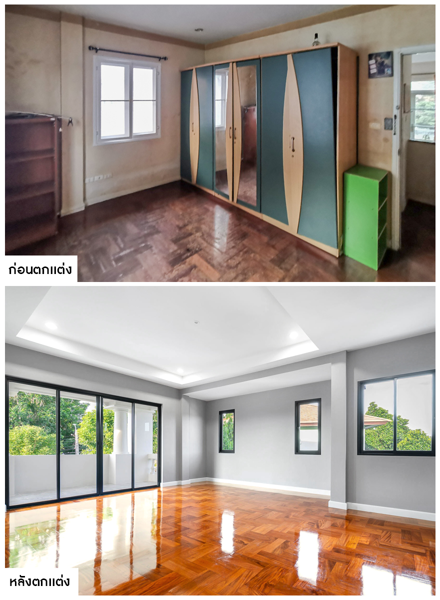 ห้องจากเดิมที่มีสภาพเก่า ไม่เหมาะแก่การพักผ่อน เราได้ปรับปรุงให้ดู Classicด้วยพื้นปาร์เก้ที่ทั้งสวยงาม คงทน นอกจากนั้นยังเปลี่ยนโทนสีภายในห้องเป็นโทนขาวทำให้ห้องดูสว่าง และกว้างขวางมากยิ่งขึ้น พร้อมประตู-หน้าต่างกระจกบานสไลด์แผ่นใหญ่ ที่สามารถรับแสงธรรมชาติได้อย่างเต็มที่