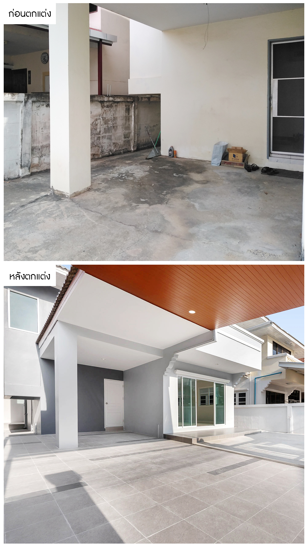 เราได้ปรับปรุงใหม่ทั้งหมด โดยการปูพื้นกระเบื้องกันลื่นลวดลายเฉพาะของบ้านบางกอกฯ ที่ทั้งสวยงามและปลอดภัย ต่อเติมเต็มหลังคาโรงจอดรถด้วยเพดานระแนงไม้เฌอร่า พร้อมติดตั้งไฟดาวน์ไลท์ที่ทั้งให้ความสว่างและประหยัดไฟครับ