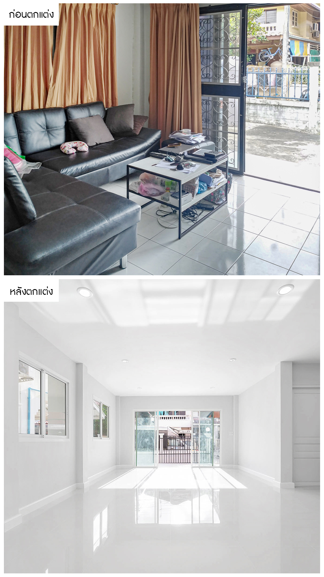 ด้วยโครงสร้างของบ้านที่ยังแข็งแรงดี ภายในเราจึงปรับปรุงในส่วนของการทาสีให้ใหม่ทั้งหมด โดยกำหนดเป็นโทนสีขาวสว่าง เพิ่มความกว้างและให้ความรู้สึกผ่อนคลายมากขึ้น ปูพื้นใหม่ด้วยกระเบื้องแกรนิโต้แผ่นใหญ่ที่ทั้งสวยงามและนิยมใช้ในบ้านยุคใหม่ พร้อมประตู-หน้าต่างกระจกบานสไลด์ที่ช่วยให้บ้านโปร่งโล่ง รับแสงธรรมชาติได้อย่างเต็มที่