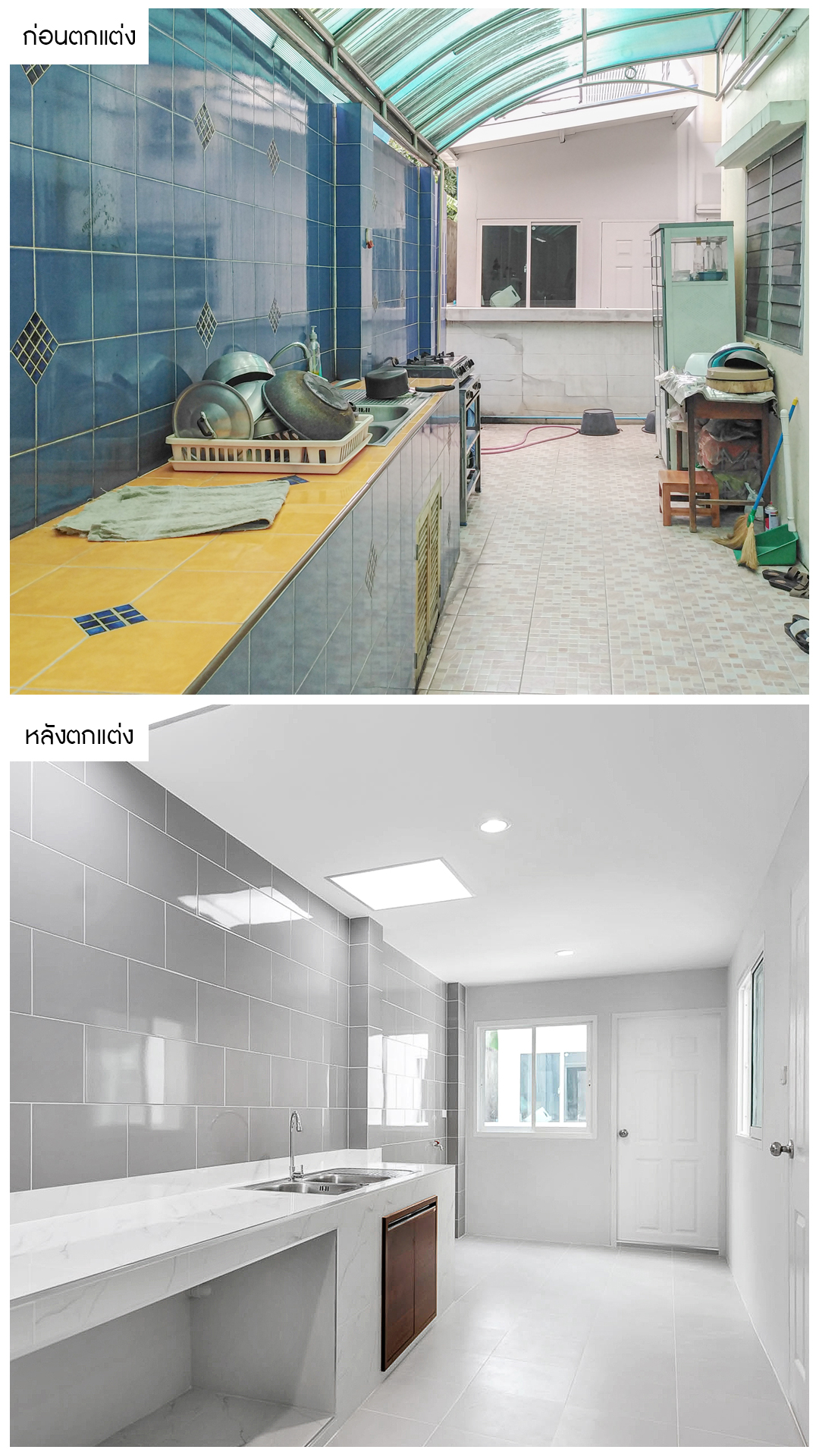 จากเดิมที่เคยเป็นครัวเปิด ดูไม่พร้อมใช้งาน เมื่อฝนตกก็ประสบปัญหาในการทำอาหารหรือ เราจึงได้ปรับปรุงใหม่โดยการต่อเติมให้กลายเป็นอีกห้องหนึ่งเลยครับ กลายเป็นห้องครัวที่จัดเป็นสัดส่วน ครบครันทุกฟังก์ชั่น ทั้งครัวเคาน์เตอร์ดีไซน์ทันสมัย ซิ้งล้างจาน และปูกระเบื้องจรดผนังที่สามารถทำความสะอาดได้ง่าย ตอบโจทย์ทุกการใช้งานเลยครับ