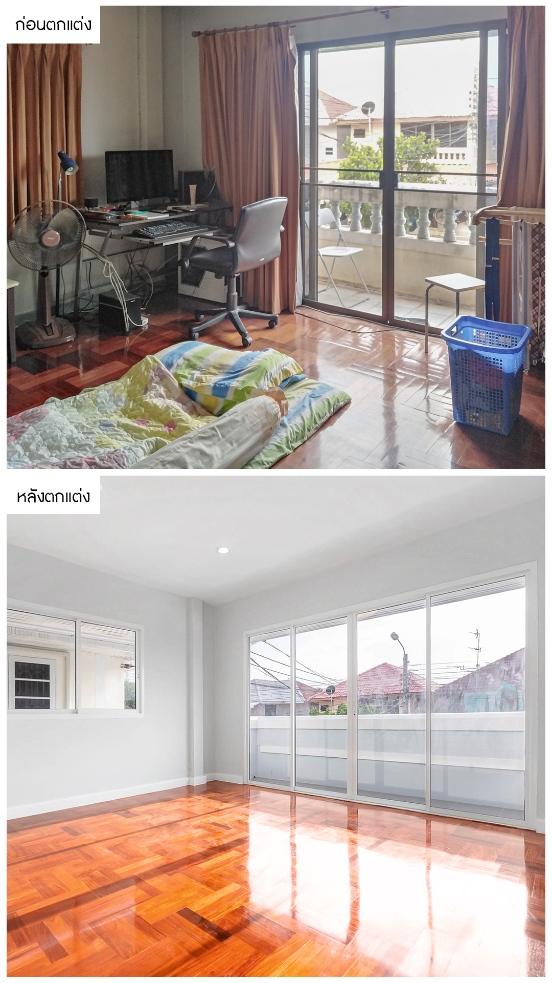 เราได้ตกแต่งใหม่ โดยการปรับปรุงพื้นไม้ปาร์เก้ที่มีความสวยงาม และคงทนให้กลับมาดูสะอาดใหม่อีกครั้ง และทำฝ้าเรียบติดตั้งไฟดาวน์ไลท์ เพื่อปรับโทนของห้องให้ดูอบอุ่น เหมาะแก่การพักผ่อน ส่วนของหน้าต่างและประตูเชื่อมระเบียง เราได้ติดตั้งให้เป็นกระจากบานสไลด์เพื่อประหยัดพื้นที่ และรองรับแสงธรรมชาติ ทำให้ห้องดูปลอดโปร่ง อากาศถ่ายเทได้สะดวกยิ่งขึ้นครับ