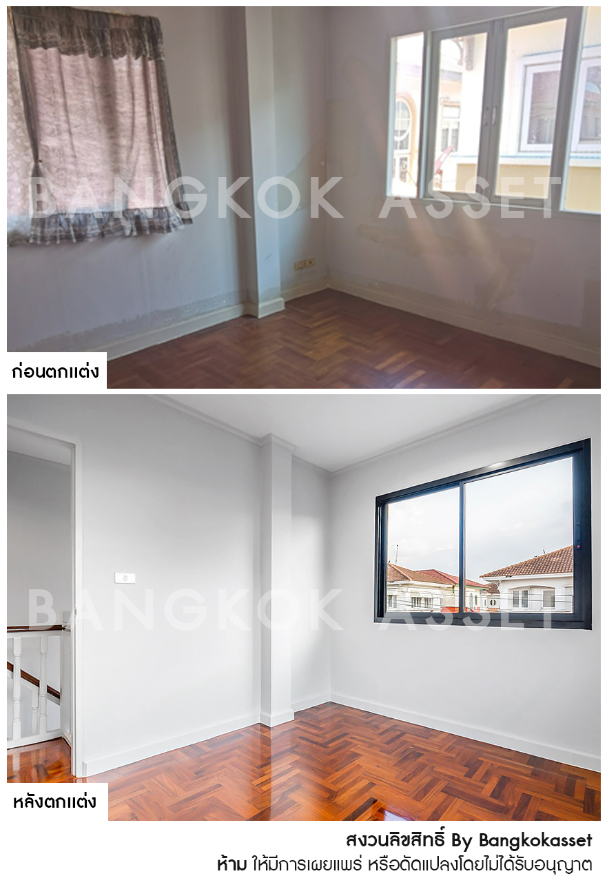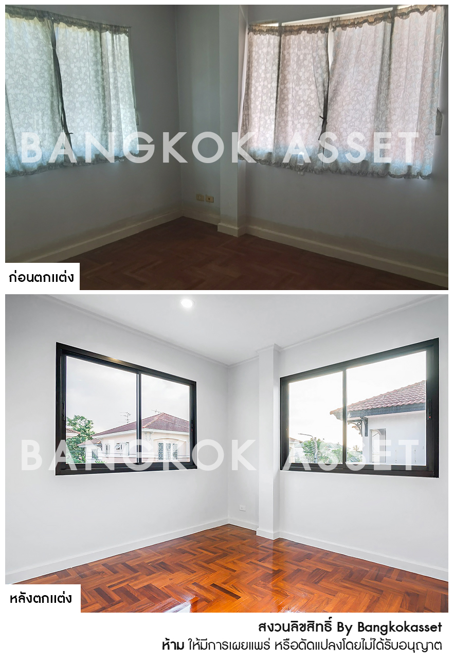 ห้องนอนทุกห้องเราขัดเคลือบพื้นไม้ให้ดูเงาเหมือนของใหม่ เปลี่ยนประตู-หน้าต่างเป็นกระจกบานใหญ่ และคุมโทนสีภายในห้องเป็นโทนขาวสว่าง เพิ่มความรู้สึกผ่อนคลายให้กับผู้อยู่อาศัยอีกด้วย