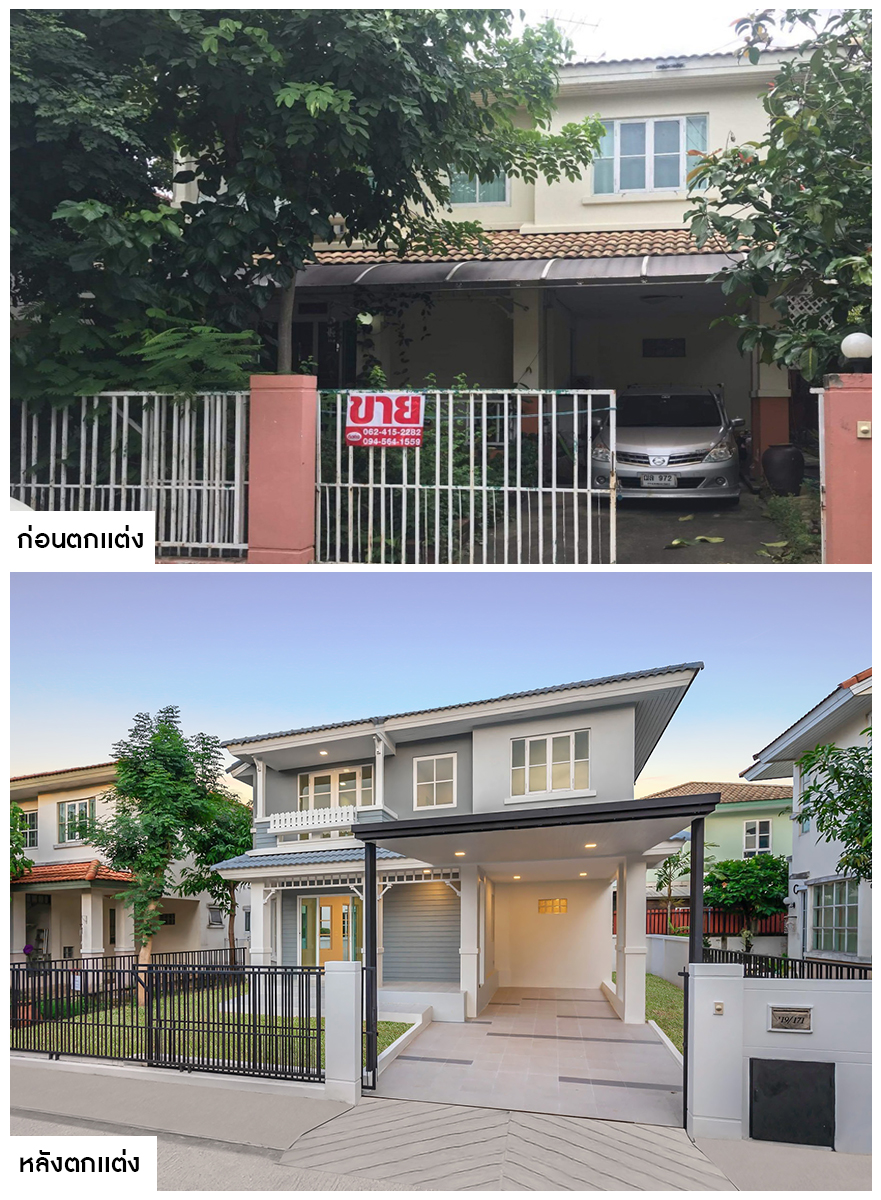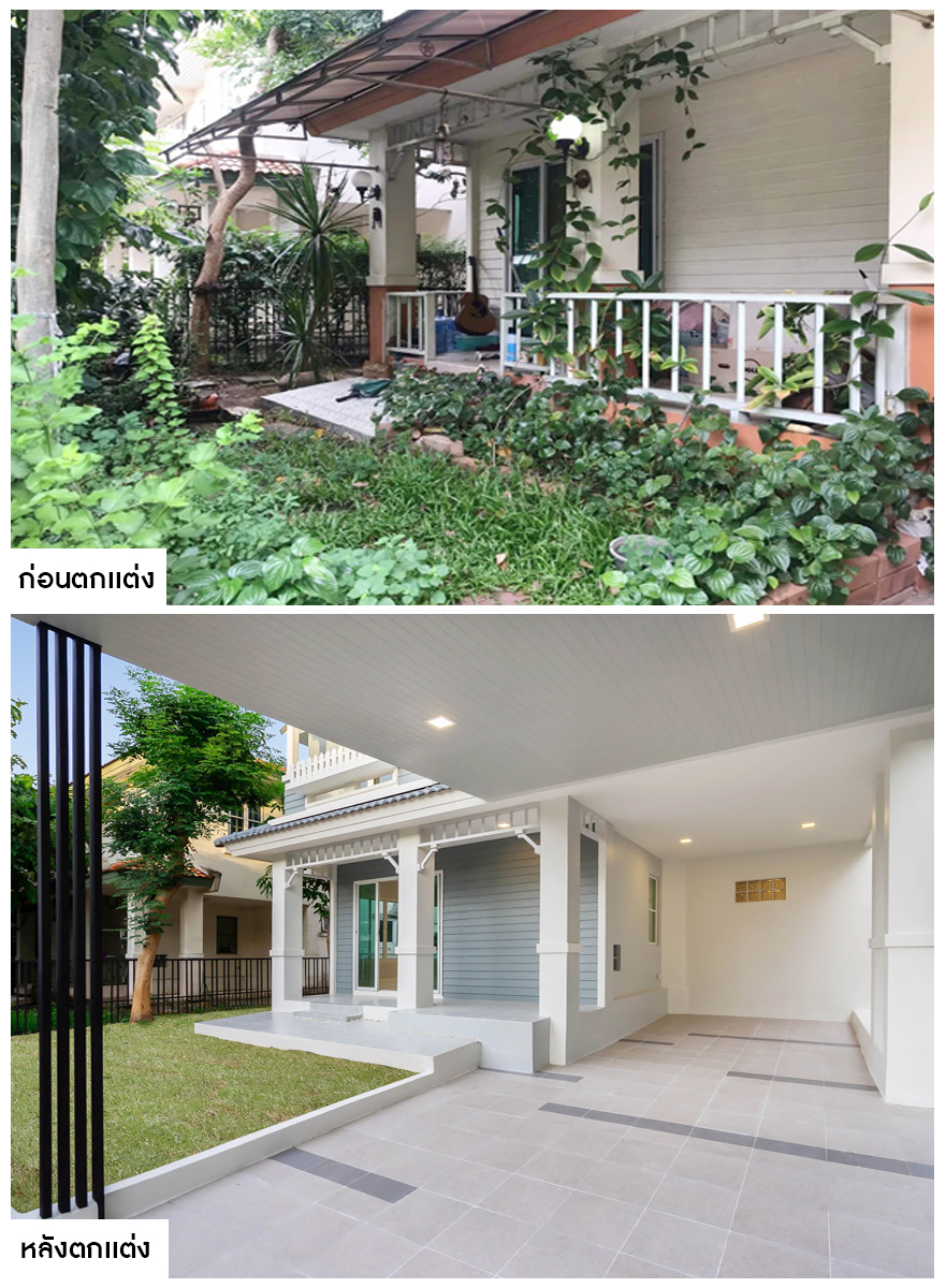 ในส่วนของหน้าบ้านที่เคยมีต้นไม้ขึ้นปกคลุม บดบังทัศนียภาพ เราได้ทำการเคลียร์ออกทั้งหมด ปรับพื้นที่ให้ดูสะอาดตา และปลอดโปร่งขึ้น ทาสีใหม่ทั้งหลัง และเปลี่ยนรั้วใหม่ให้สวยงามรับกับตัวบ้าน รองรับทุกกิจกรรมจากเจ้าของบ้านคนใหม่เพื่อแต่งเติมไอเดียได้อย่างเต็มที่