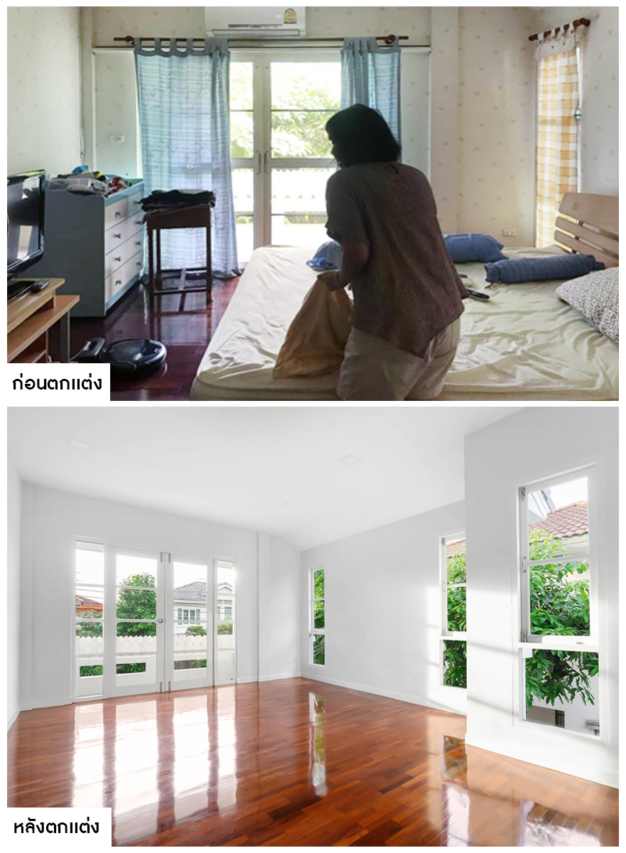 มาที่ห้องนอนกันบ้างครับ สำหรับห้องนอนเราได้ปูพื้นไม้ปาร์เก้ขัดเงาที่มีความสวยงาม และคงทน ทาสีใหม่เป็นโทนสีขาว ให้ความรู้สึกผ่อนคลาย ในส่วนของประตู-หน้าต่างได้ติดตั้งเป็นประตูบานเลื่อนเพิ่มพื้นที่ และเพิ่มแสงสว่างให้ห้องนอน ทำให้ห้องดูปลอดโปร่ง อากาศถ่ายเทได้สะดวกครับ