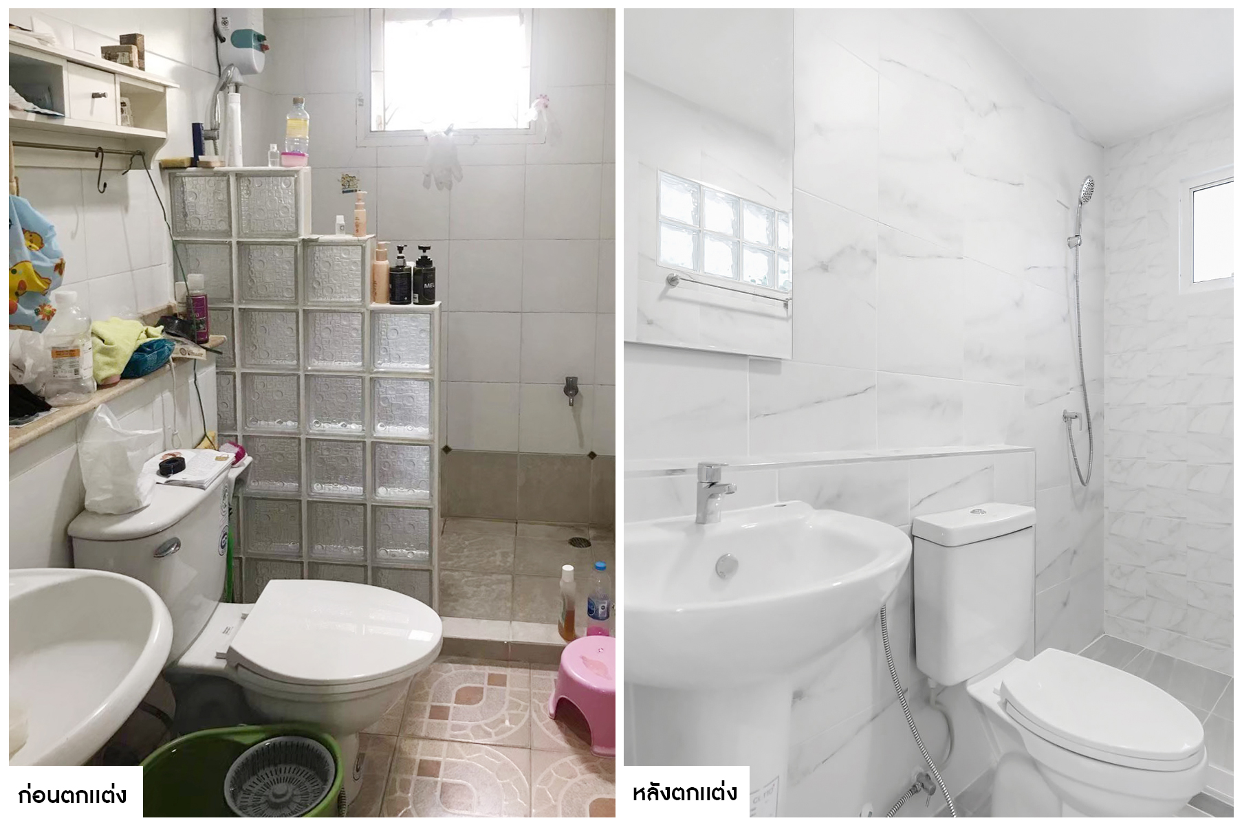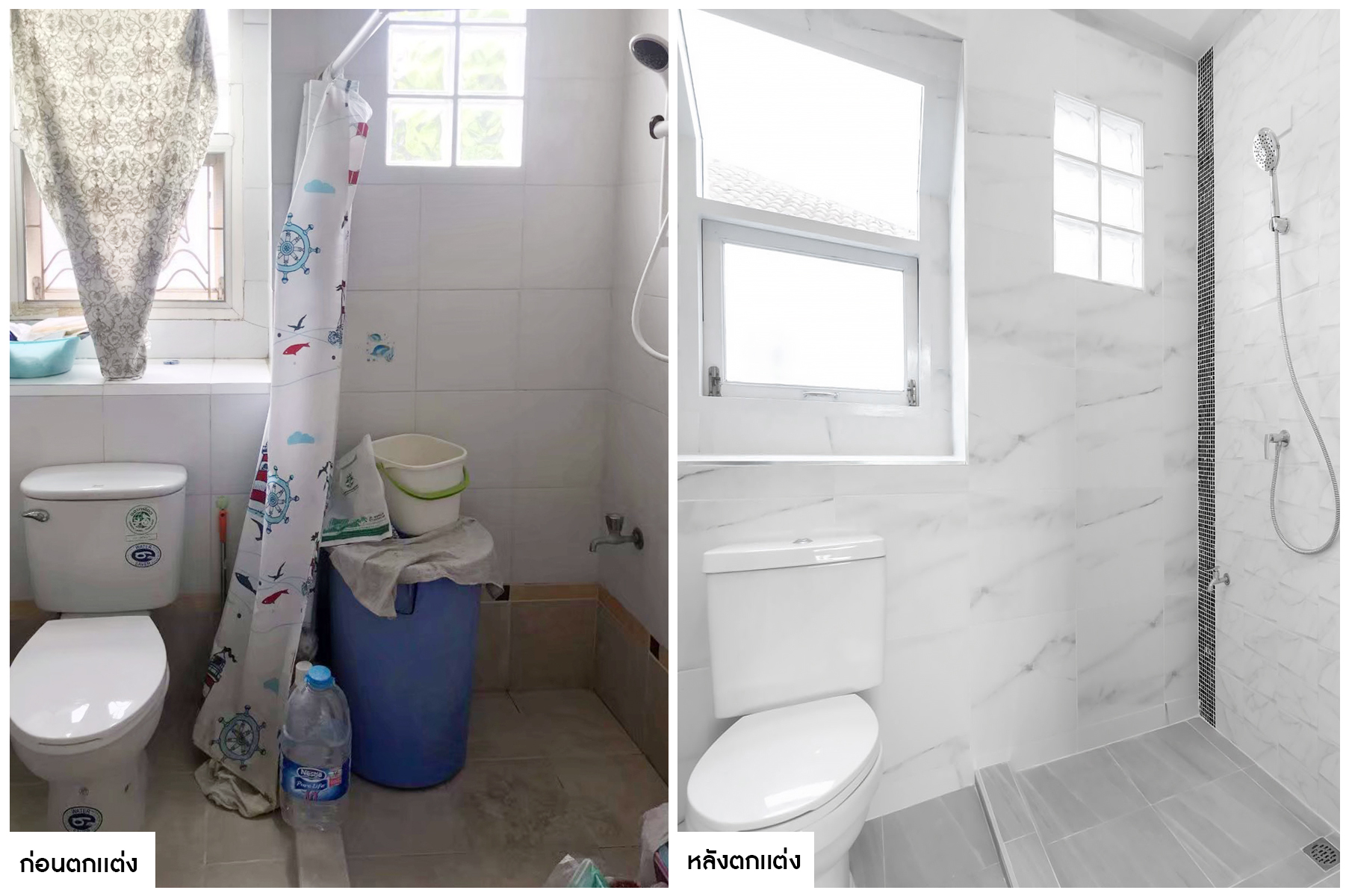 สำหรับห้องน้ำ ได้ปรับพื้นใหม่โดยการปูกระเบื้องกันลื่นเพื่อความสวยงาม และปลอดภัยกับผู้ใช้งาน ปูกระเบื้องผนังลายหินอ่อนสุดหรู พร้อมคัดสรรวัสดุคุณภาพ ครบครันทุกฟังก์ชั่นการใช้งานเลยครับ