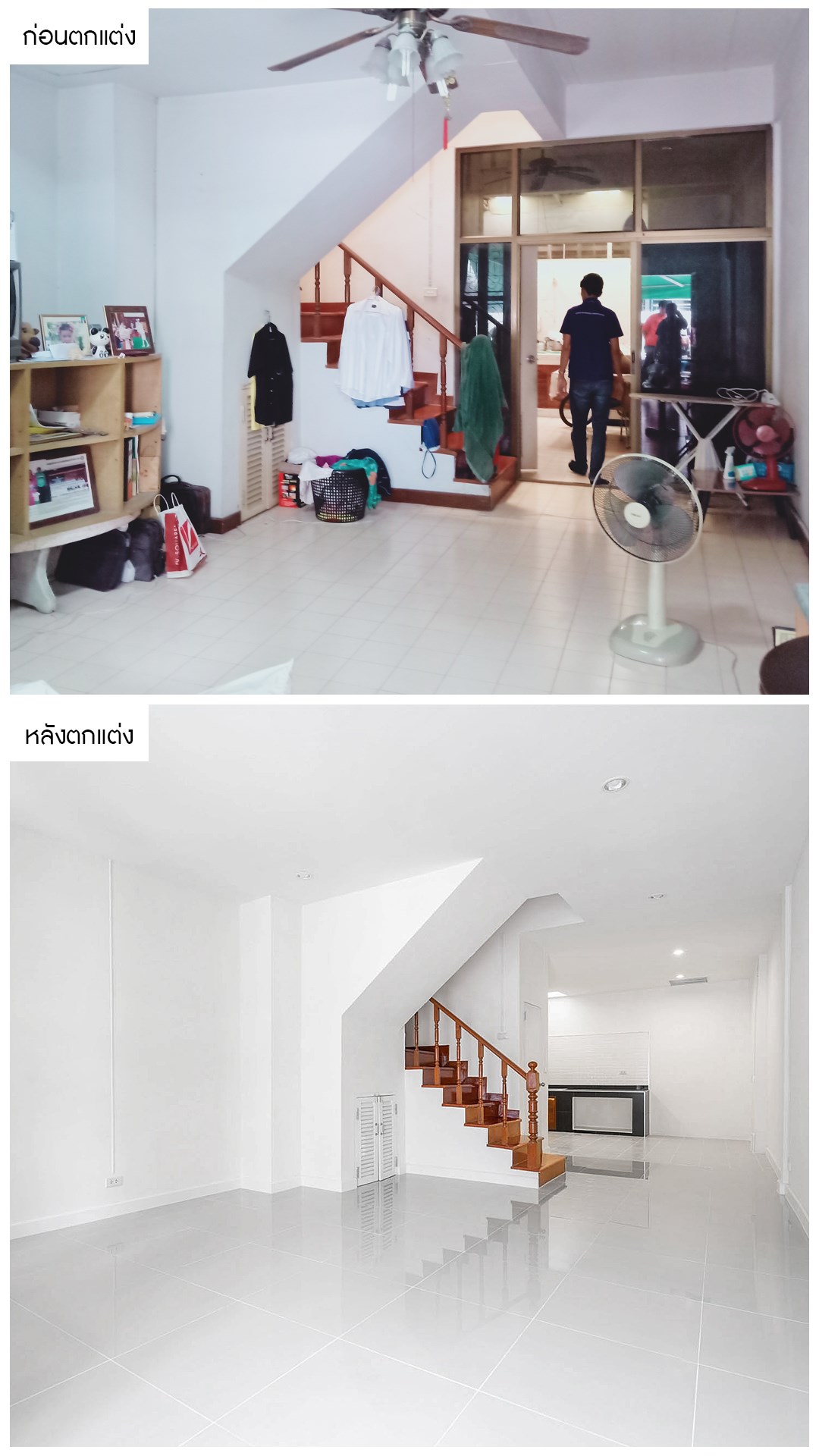 ภายในบ้านได้ทำการปูกระเบื้องแกรนิโต้ขนาดใหญ่ พร้อมทาสีใหม่โดยเลือกสีขาว ที่ช่วยทำให้บ้านดูกว้าง และโปร่งขึ้น