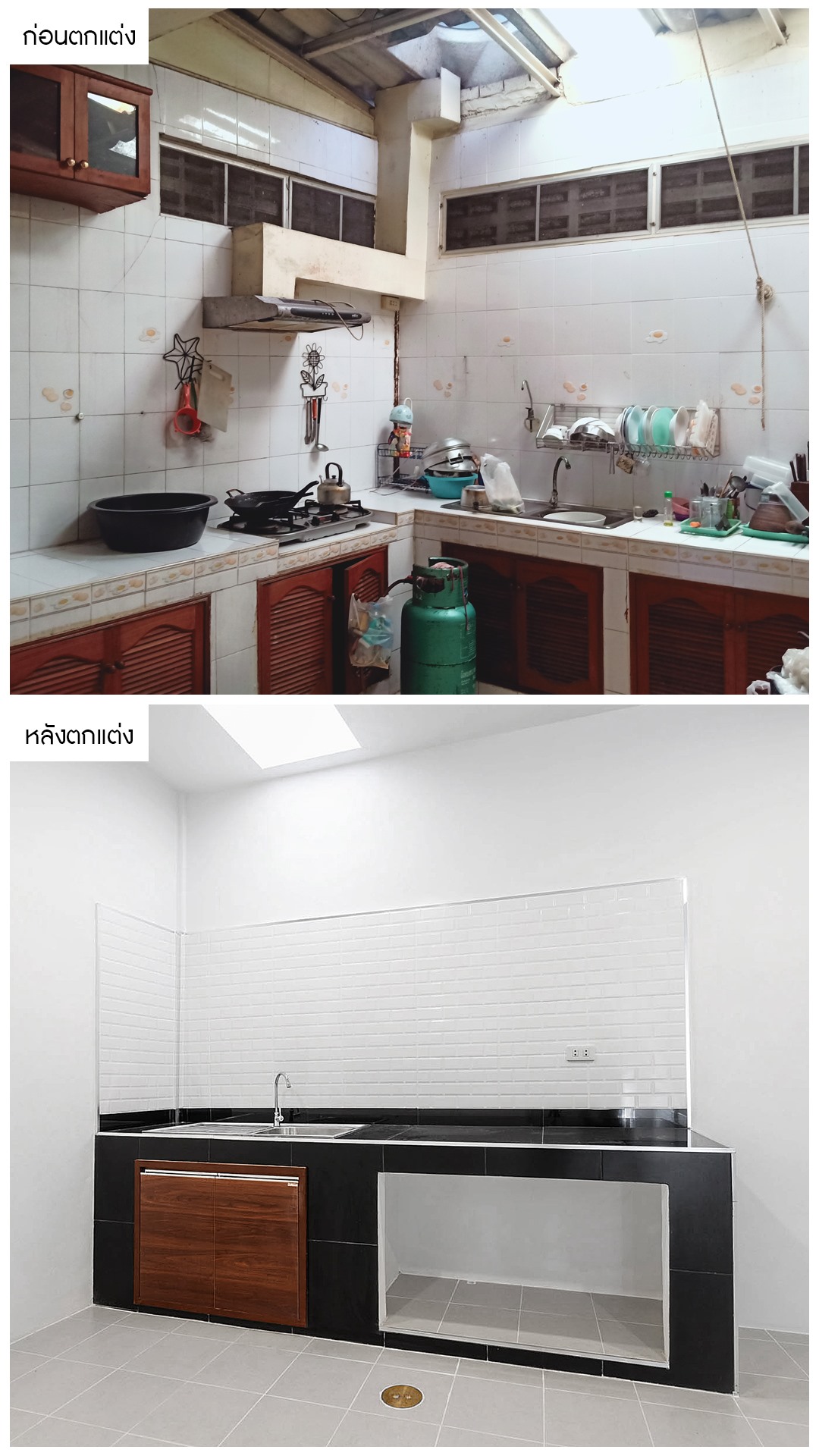 ในส่วนของห้องครัว จากโครงสร้างที่ยังแข็งแรงอยู่เราจึงปรับปรุงในบางส่วน โดยการปูพื้นกระเบื้องใหม่ ติดบานเคาท์เตอร์เพิ่มความสวยงาม และติดตั้งซิงค์ทำความสะอาด