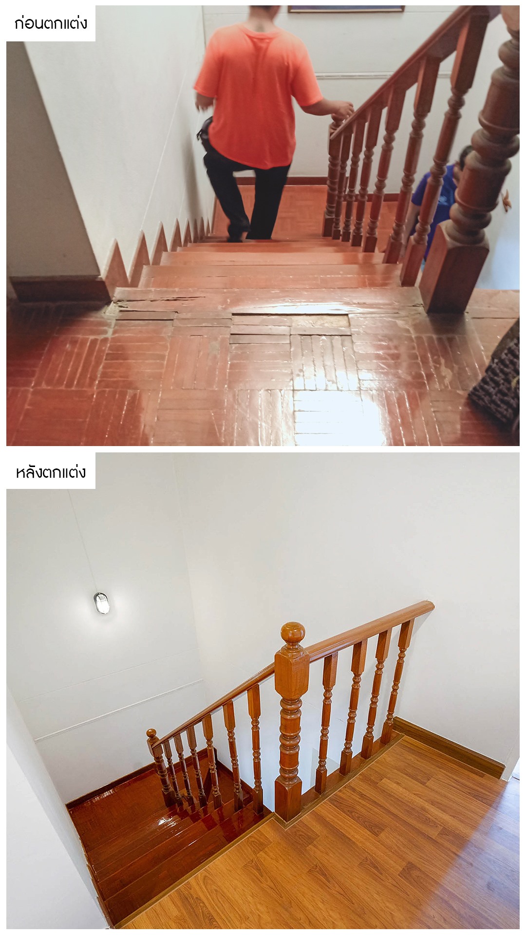 ในส่วนของบันไดจากเดิมที่เป็นพื้นไม้ปาร์เก้เก่าๆ เราได้เปลี่ยนใหม่โดยเลือกใช้เป็นพื้นลามิเนต และเลือกใช้พื้นไม้ในส่วนของบันไดที่ให้ผิวสัมผัสเสมือนไม้จริง ทำให้รู้สึกถึงการเดินที่เป็นธรรมชาติ และดูสวยงาม ทนทานมากขึ้น