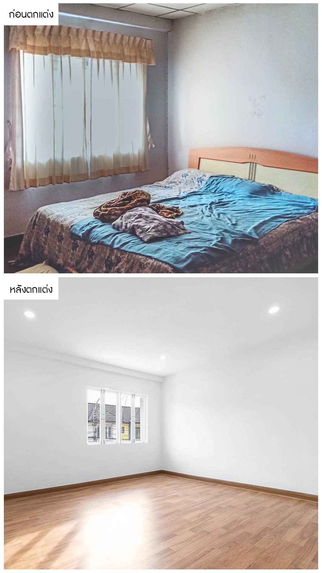 ห้องนอนใหญ่เราได้ปูพื้นใหม่เป็นลามิเนตที่มีความสวยงาม และคงทน พร้อมติดตั้งโคมไฟแบบดาวน์ไลท์ที่ทำให้ดูโมเดิร์นยิ่งขึ้น และทาสีตัวห้องใหม่เป็นโทนสว่าง ทำให้ห้องดูปลอดโปร่ง อากาศถ่ายเทได้สะดวก