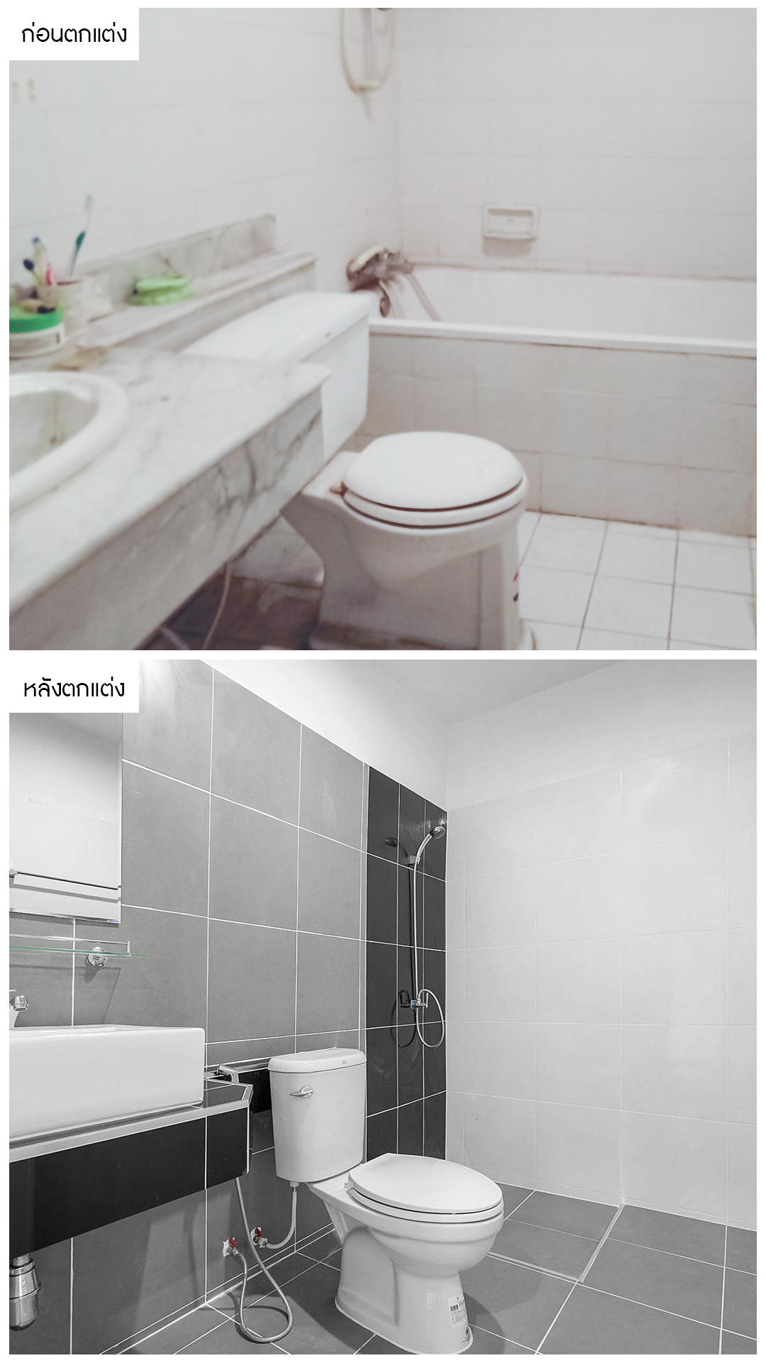 สำหรับห้องน้ำ ได้ปรับพื้นใหม่โดยการปูกระเบื้องกันลื่นเพื่อความสวยงาม และปลอดภัยกับผู้ใช้งาน พร้อมเปลี่ยนสุขภัณฑ์ให้ใหม่ทั้งหมด พร้อมใช้งานกันเลยครับ