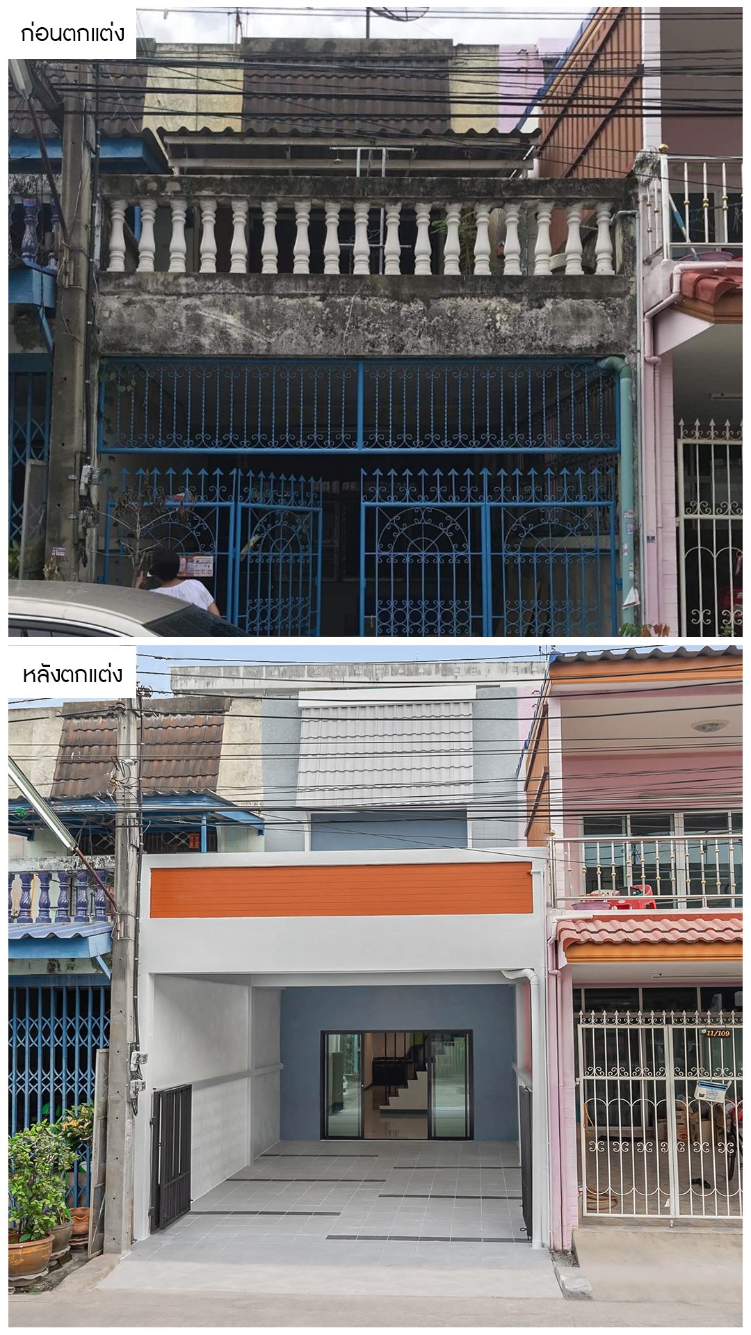 จากภายนอกบ้านที่ดูสภาพเก่า ไม่น่ามอง เราได้ทำการรีโนเวทโดยทาสีใหม่ทั้งหลัง โดยเลือกโทนสีสว่างตัดส้มที่มีความโดดเด่น และให้ความรู้สึกโมเดิร์นสวยสะดุดตา พร้อมเปลี่ยนรั้วใหม่ทั้งหมด เพื่อให้หน้าบ้านโปร่งกว้าง และมีฮวยจุ้ยดีอีกด้วยครับ