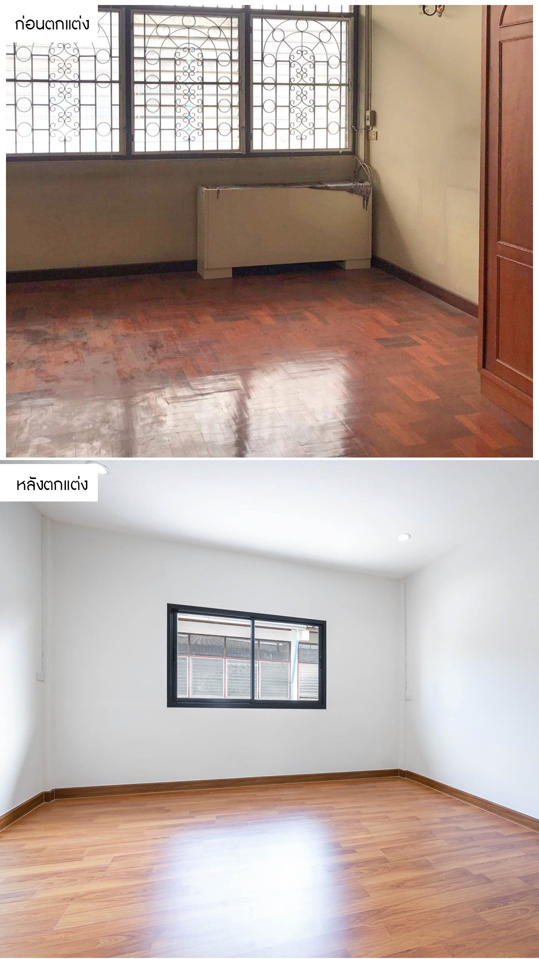 ห้องนอนที่สภาพดูเก่าทึบ ไม่เหมาะกับการพักผ่อน เราได้ปรับปรุงใหม่หมดตั้งแต่กำหนดธีมห้องเป็นโทนสว่างเพื่อให้ห้องโปร่งกว้าง และรู้สึกผ่อนคลาย และเปลี่ยนพื้นห้องเป็นลามิเนตที่สวยงามและทันสมัย พร้อมหน้าต่างแบบกระจกบานเลื่อนและไฟดาวน์ไลท์ที่ทำให้ห้องดูมีมิติและประหยัดไฟอีกด้วย