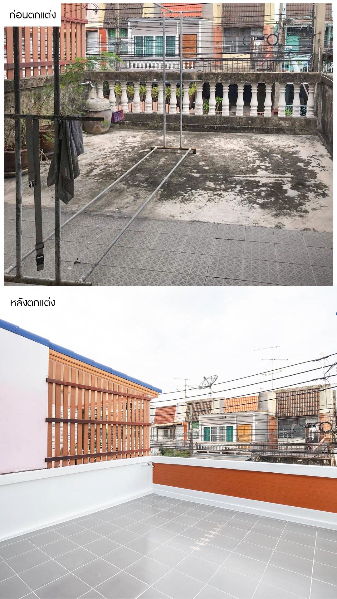 เทอเรซที่กว้างแต่มีสภาพเก่าไม่พร้อมใช้งาน เราได้ทำการปรับปรุงใหม่ตั้งแต่ปูพื้นกระเบื้องเพื่อให้สามารถทำกิจกรรมได้หลากหลายขึ้น และยังทำความสะอาดง่ายอีกด้วย พร้อมเปลี่ยนระเบียงจากแบบเก่าที่ดูไม่สวยงามเป็นแบบทันสมัยขึ้นอีกด้วย